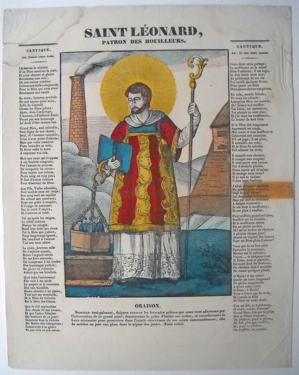Réunion de + de 55 épreuves, gravure sur bois ou lithographie coloriées au pochoir, montées sur papier épais, toutes dimensions, état B à TTB: Galerie religieuse, Saint Mathieu, évangéliste ; Sainte Anne, mère de la très sainte Vierge 211 ; Sainte Agathe, vierge et martyre ; Saint Léonard, patron des houilleurs ; Saint Charles 150 (double ex.) ; Sainte Agnès ; Cantiques spirituels, Saint Prudent, martyr ; Saint Augustin 144 ; Saint Bernard ; Saint Blaise, évêque ; Saint Antoine, ermite, 141 ; Saint Philippe, apôtre ; Saint Barthelémy, apôtre ; Saint Henri, empereur et roi (double ex.) ; Saint Vincent de Paule 207 ; Sainte Véronique ; Ste Thérèse de Jésus ; Saint Come et Damien, martyrs ; Saint Vincent, patron des vignerons ; Galerie religieuse, Saint Honoré ; Galerie religieuse, l'Ange Gardien ; Galerie religieuse, Saint Antoine de Padoue ; Galerie religieuse, St Crépin et St Crépinien, patrons des cordonniers ; Galerie religieuse, St Etienne, premier martyr ; Galerie religieuse, Saint Martin, évêque ; Sainte Pétronille ; Saint Cornély, protecteur des bestiaux ; Saint Sébastien, martyr ; Sainte Françoise 223 ; Saint Michel 192 ; Saint François-Xavier, apôtre des Indes ; Saint François d'Assise ; Sainte Germaine (double ex.) ; Saint Laurent ; Sainte Elisabeth 221 ; Saint Marc, évangéliste ; Saint Paul, apôtre 194 ; Saint Nicolas 193 ; 3 planches à compartiments (6x4), (5x3) et (2x2) ; Le bienheureux et vénérable P. Monfort missionnaire ; Le bienheureux Pierre Fourier de Mattaincourt ; Jésus, Marie, Joseph ; Jugement et condamnation de N.S. Jésus-Christ ; Le très saint-sacrement ; La Ste Famille ; Christ aux anges [ca 1837] ; Massacre des innocens ; Le bon pasteur ; Délivrance des âmes du purgatoire ; Ste Barbe, vierge et martyre ; Sainte Marthe.