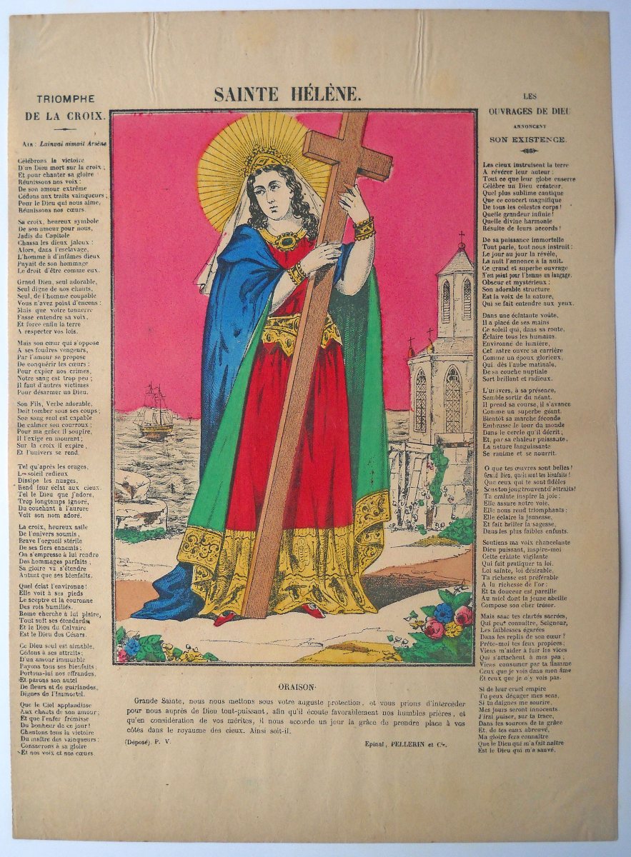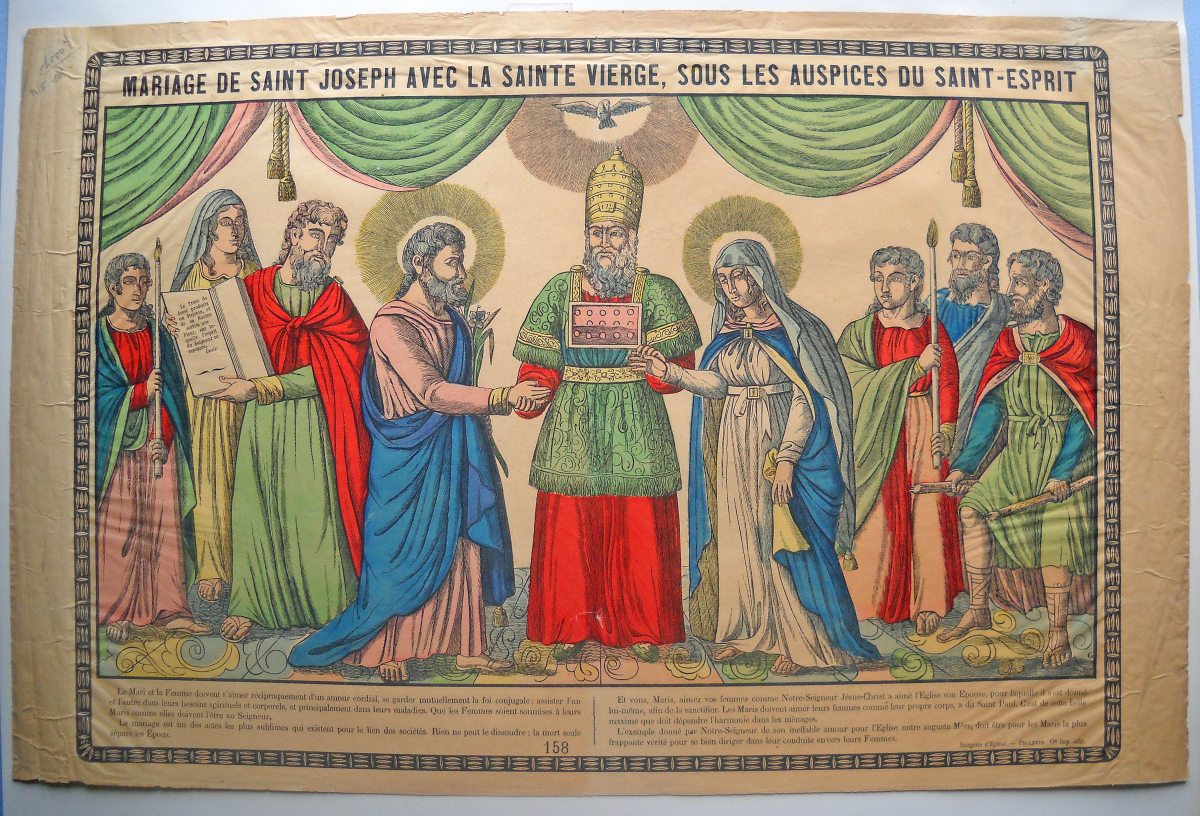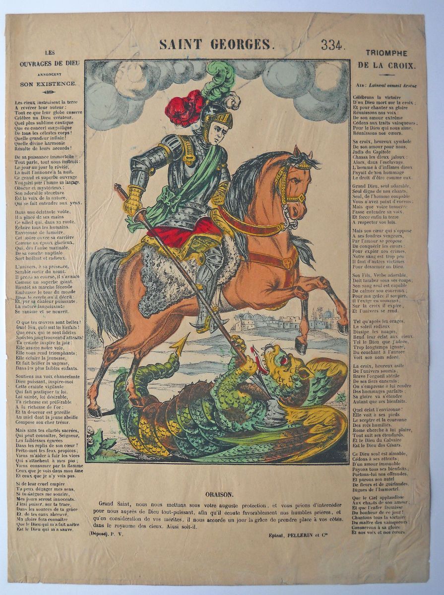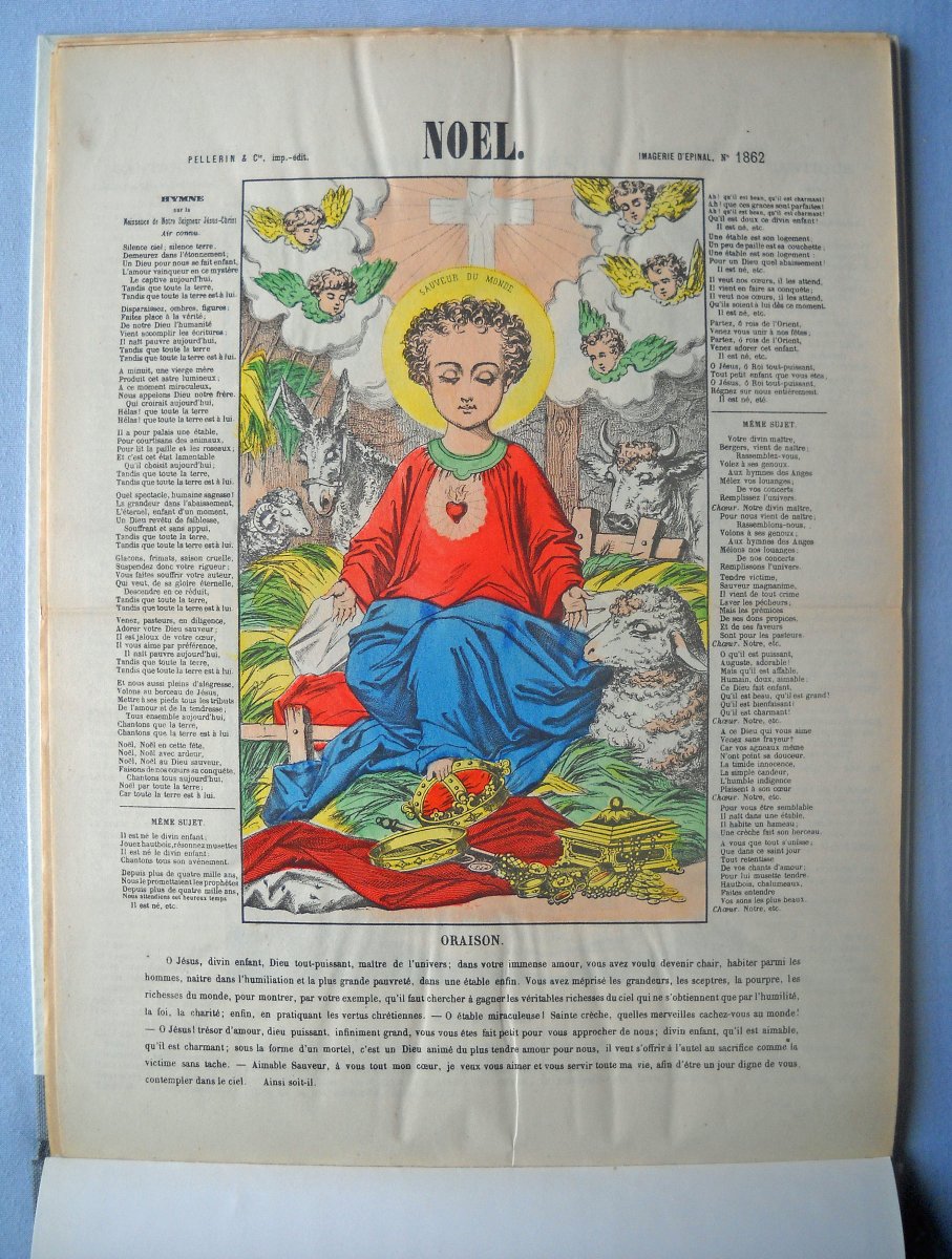72 épreuves, gravure sur bois ou lithographie rehaussée au coloris de l'époque, dont 8 montées sur papier épais, toutes dimensions, état B à TB: Mariage de Saint Joseph avec la sainte Vierge, sous les auspices du Saint Esprit 158, 42 x 64 cm ; Saint Joseph, époux de Marie, 64 x 41 cm ; Sainte Hélène ; Sainte Cécile ; Saint Fiacre, patron des jardiniers 329 ; Fuite en Égypte 245 ; Saint Georges 334 ; Sainte Françoise 402 ; Album in-4 à l'italienne, reliure moderne en papiernage, titré " Tirages anciens - Imagerie Pellerin à Épinal N°1 ", contenant 46 planches, lithographie coloriée, sur papier mécanique, 40 x 30 cm, état TB: Noël 1862 ; Sommeil de Jésus 1846 ; Jésus, Marie, Joseph 1866 ; Baptême de N.S. Jésus-Christ 1838 ; La Sainte Cène 1906 ; Le tribunal injuste 1824 ; Calvaire de Jérusalem 1845 ; La robe de N.S. Jésus-Christ 1851 ; Le Christ aux stations 1827 ; L'horloge de la passion 1903 ; Les cinq plaies de N.S. Jésus-Christ 1854 ; Christ ayez pitié de nous 1833 ; Ascension de N.S. Jésus-Christ 1860 ; Véritable portrait de N.S. Jésus-Christ 1807 ; Le très saint sacrement 1865 ; Litanies de la sainte Vierge 2167 ; Sacré Cur de Marie 1801 ; Le mois de Marie 1863 ; Notre-Dame auxiliatrice 248 ; Notre-Dame de grâce 1879 ; Notre-Dame d'Espérance 1892 ; De N.-D. de Liesse 1886 ; Notre-Dame du Mont-Carmel 1880 ; Médaille miraculeuse 1905 ; Apparition de la sainte Bible 1894 ; L'Ange gardien 1895 ; Sainte Julie 1233 ; Sainte Philomène 2103 ; Sainte Victoire 2112 ; Sainte Suzanne 2109 ; Ste Philomène 2071 ; Sainte Rose de Lima 2105 ; Ste Joséphine 408 ; Sainte Louise 2082 ; Saint Donat martyr 2025 ; Bienheureux Gérard Majella 2065 ; Saint Eustache martyr 2066 ; Saint Alexis 2010 ; Christ aux Saintes femmes ; médaille miraculeuse 2115 ; Le roi des rois ; la reine des cieux 2120 ; Le Bon pasteur ; Laissez venir à moi les petits enfants 2121 ; Christ aux anges ; Christ aux saintes 2122 ; 4 planches à compartiments ; etc.
