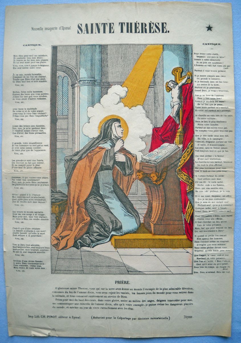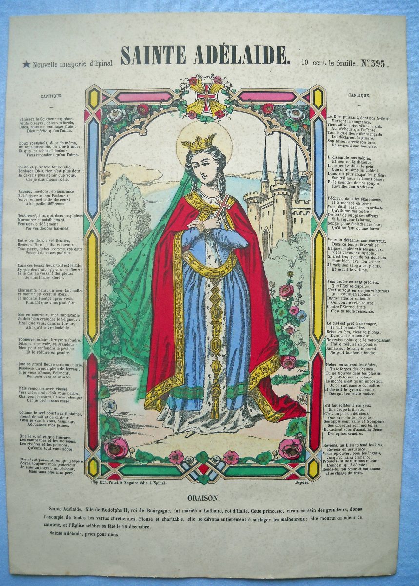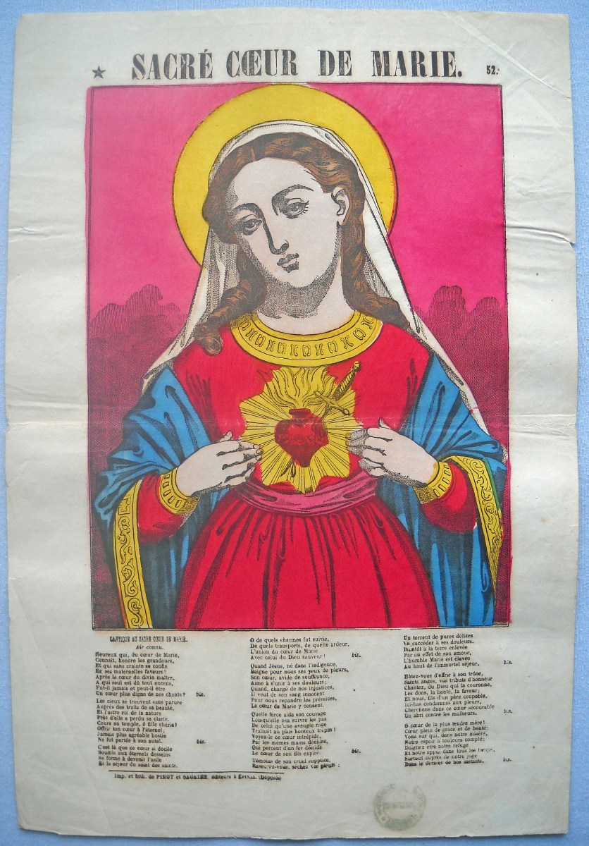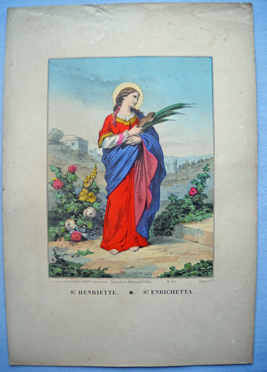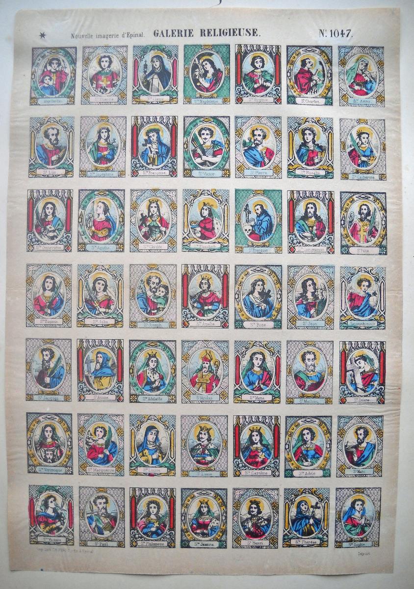 Lot de 29 lithographies rehaussées de coloris d'époque, certaines portant le tampon de colportage, env. 40 x 30 cm, dont: Sainte Adélaïde ; Saint Paul ; Sainte Thérèse ; Procession de Ste Anne d'Auray ; Saint Nicolas ; Sainte Clémence, Jésus-Christ tombe en portant sa croix ; La Cène ; Saint Joseph ; Saint Pierre (3 ex.) ; Sacré cur de Marie ; Saint Jean-Baptiste (2 ex.) ; Sainte Joséphine ; Le martyre de Saint Etienne ; Saint Michel ; Saint Sébastien ; Sainte Agathe ; L'Ange gardien ; La Ste Vierge, l'enfant Jésus et le petit Saint Jean ; Ste Henriette ; Ste Thérèse ; La Sainte Famille ; La Vierge au donataire ; 2 planches à compartiments de saintetés.