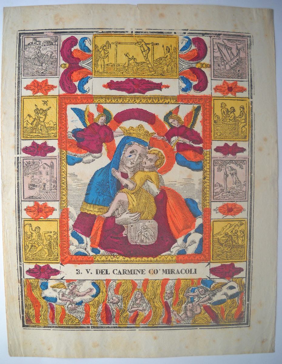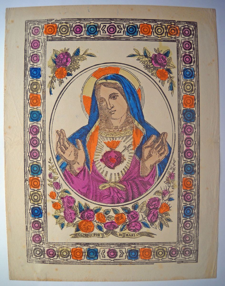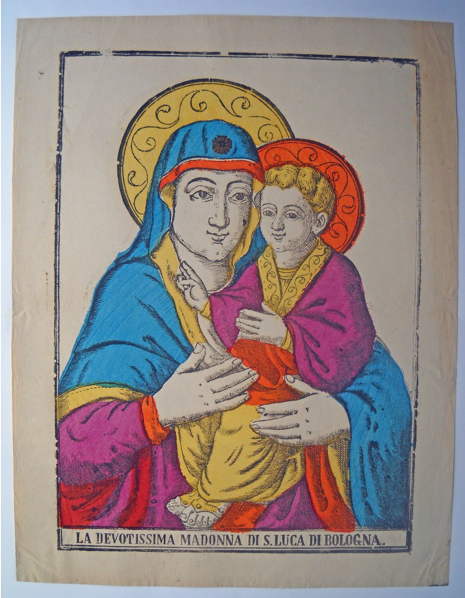 9 épreuves, gravure sur bois dont 8 à rehauts de coloris d'époque, montées sur papier épais, env. 44 x 34 cm dont 3 planches à compartiments de saintetés ; Familia sacra ; La devotissima Madonna Di S. Luca di Bologna ; B. V. di Caravaggio ; Sacro Cuor di Maria ; B.V. del Carmine co' miracoli ; Sia Lodato Il Santissimo Sacramento.
