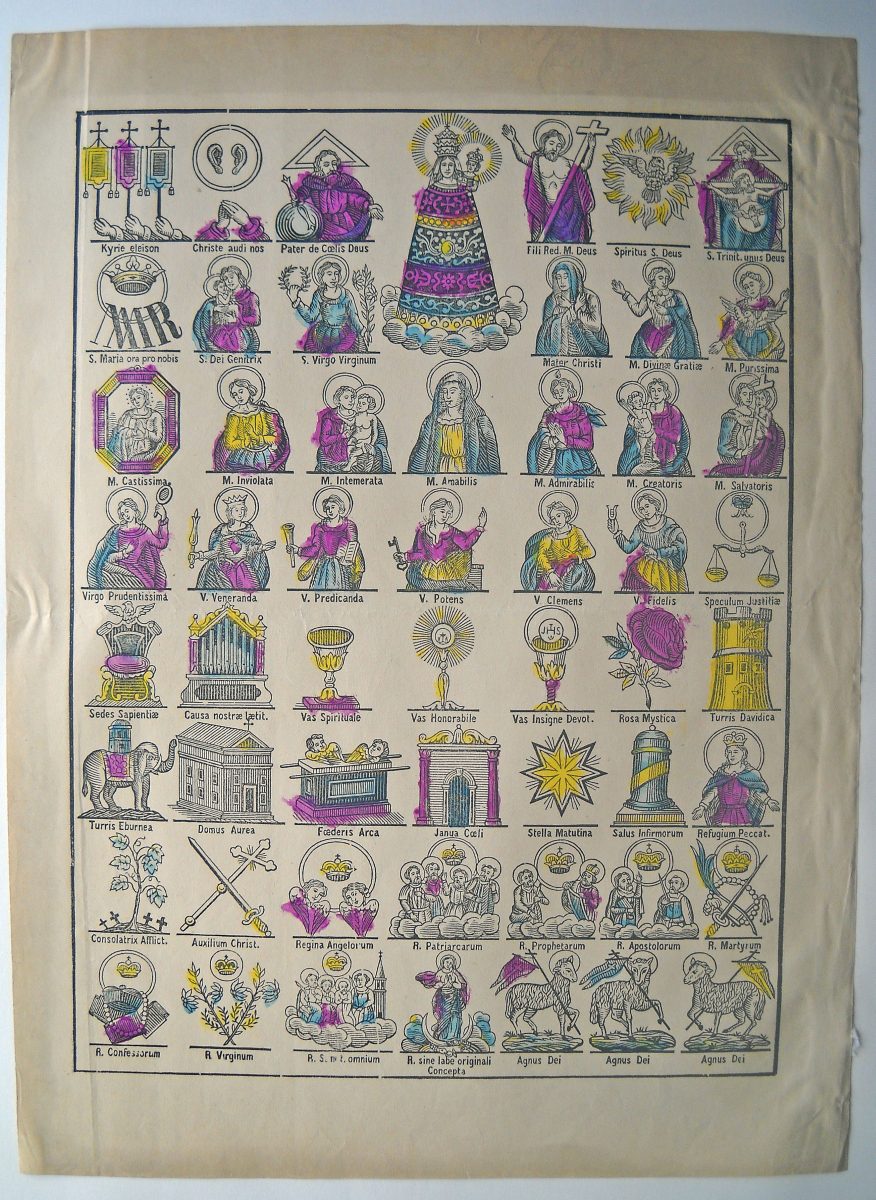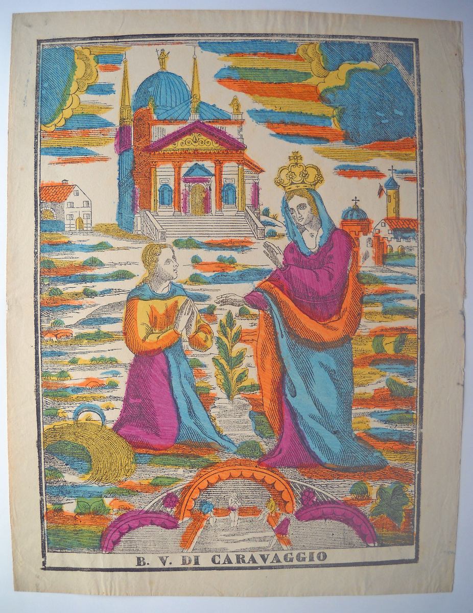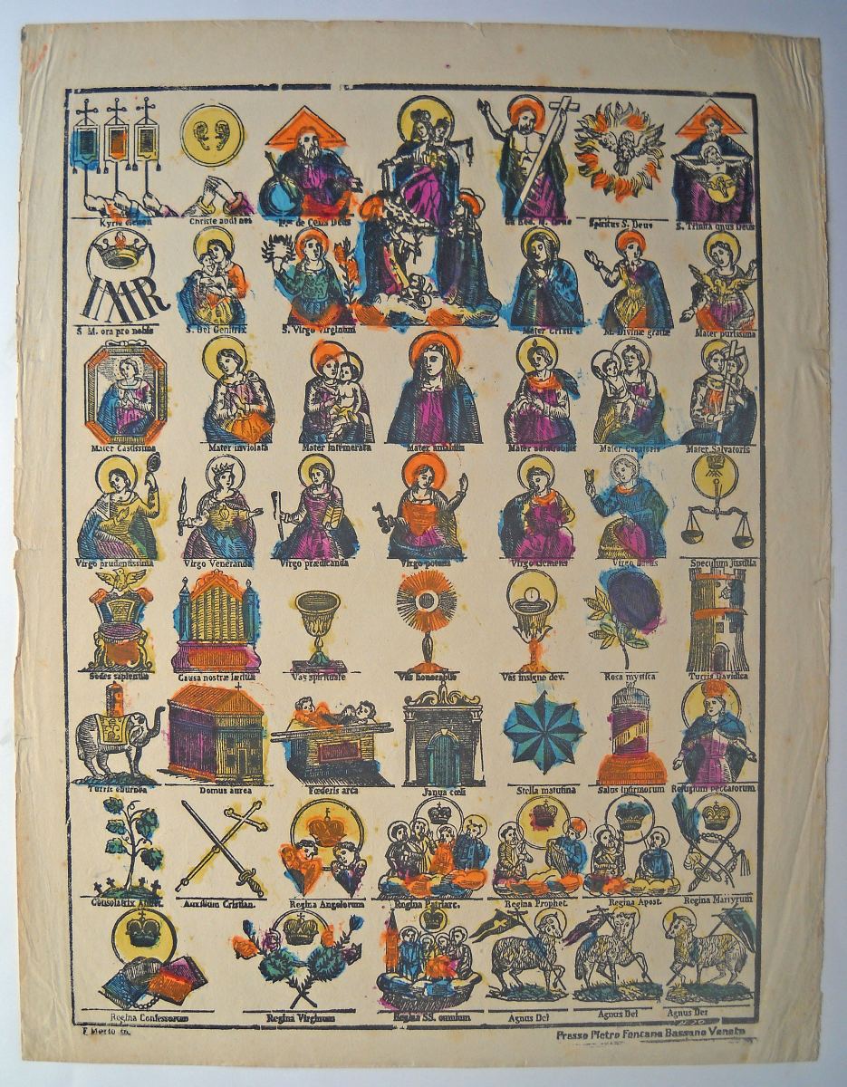 9 épreuves, gravure sur bois dont 8 à rehauts de coloris d'époque, montées sur papier épais, env. 44 x 34 cm dont 3 planches à compartiments de saintetés ; Familia sacra ; La devotissima Madonna Di S. Luca di Bologna ; B. V. di Caravaggio ; Sacro Cuor di Maria ; B.V. del Carmine co' miracoli ; Sia Lodato Il Santissimo Sacramento.