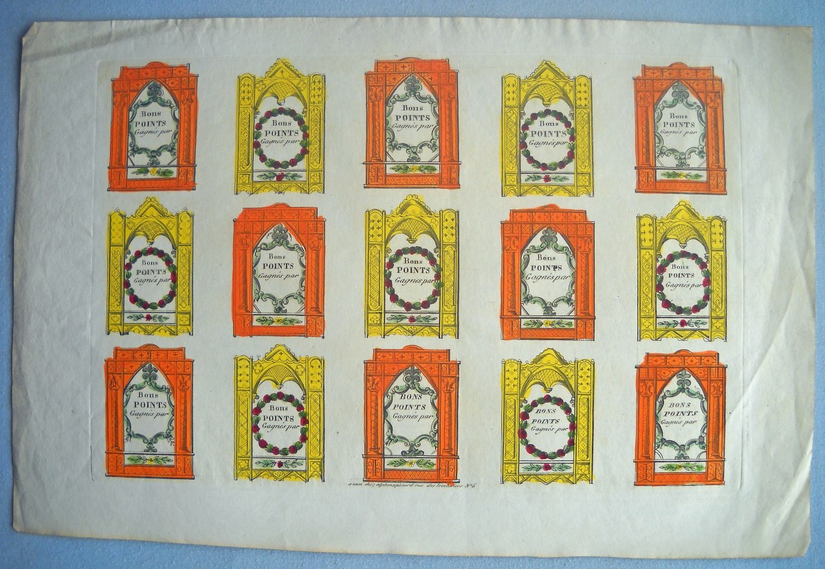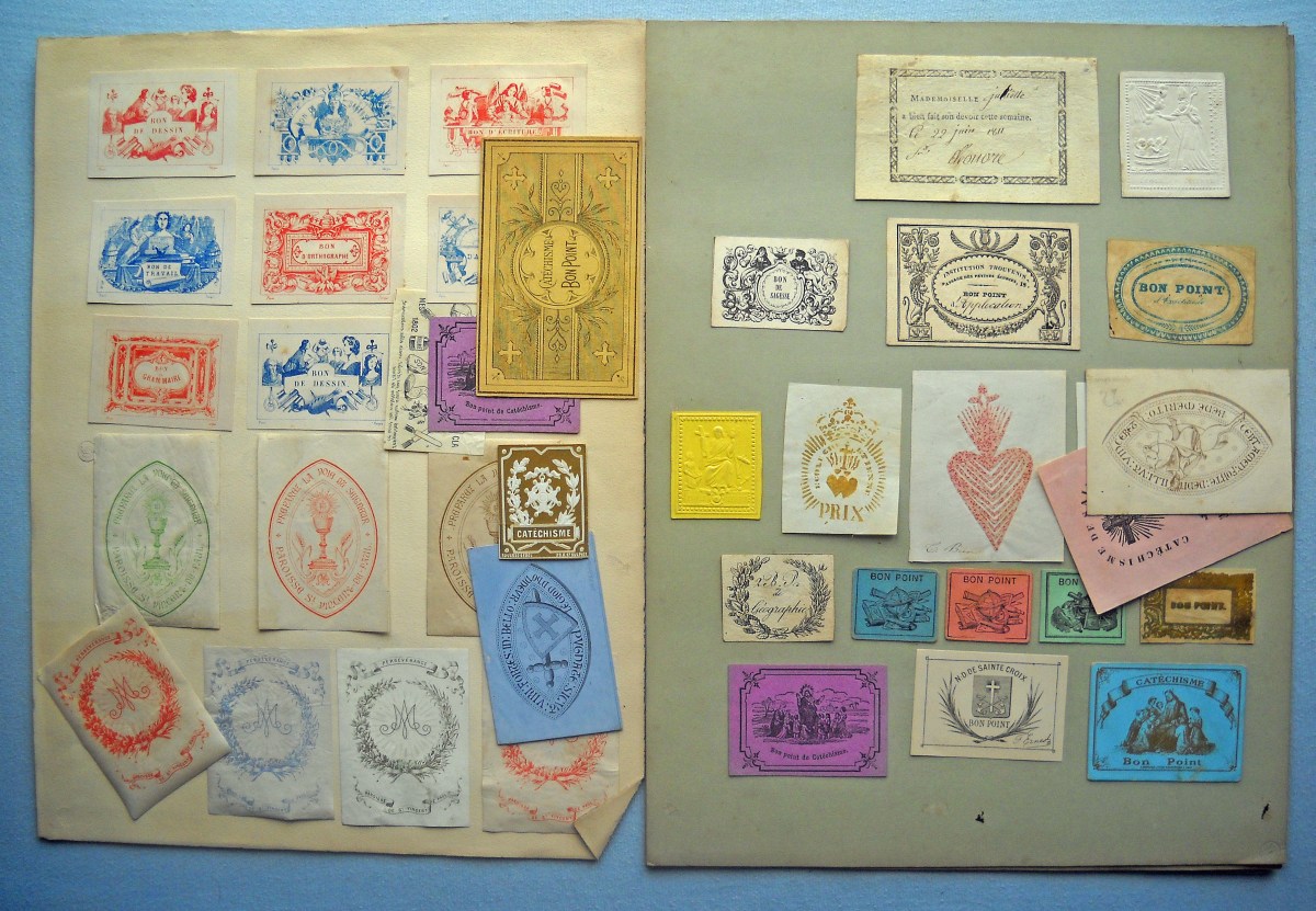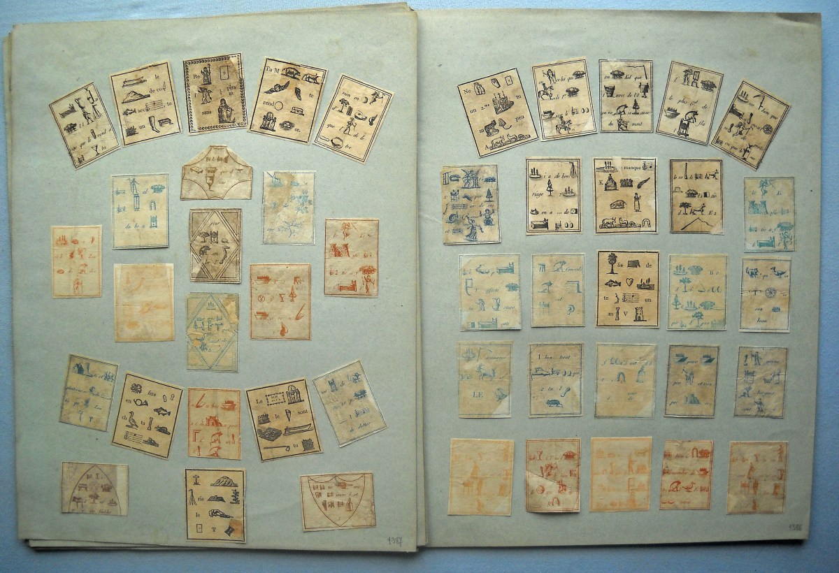 Lot de + 20 de planches de vignettes à découper et + de 40 vignettes découpées, gravées en taille-douce ou lithographiées, certaines rehaussées de coloris d'époque, à représentation de rébus, demande et réponse, bons points scolaires et religieux, etc. - Album à l'italienne " Les cent et un rébus charivariques ", 1847 (incomplet).