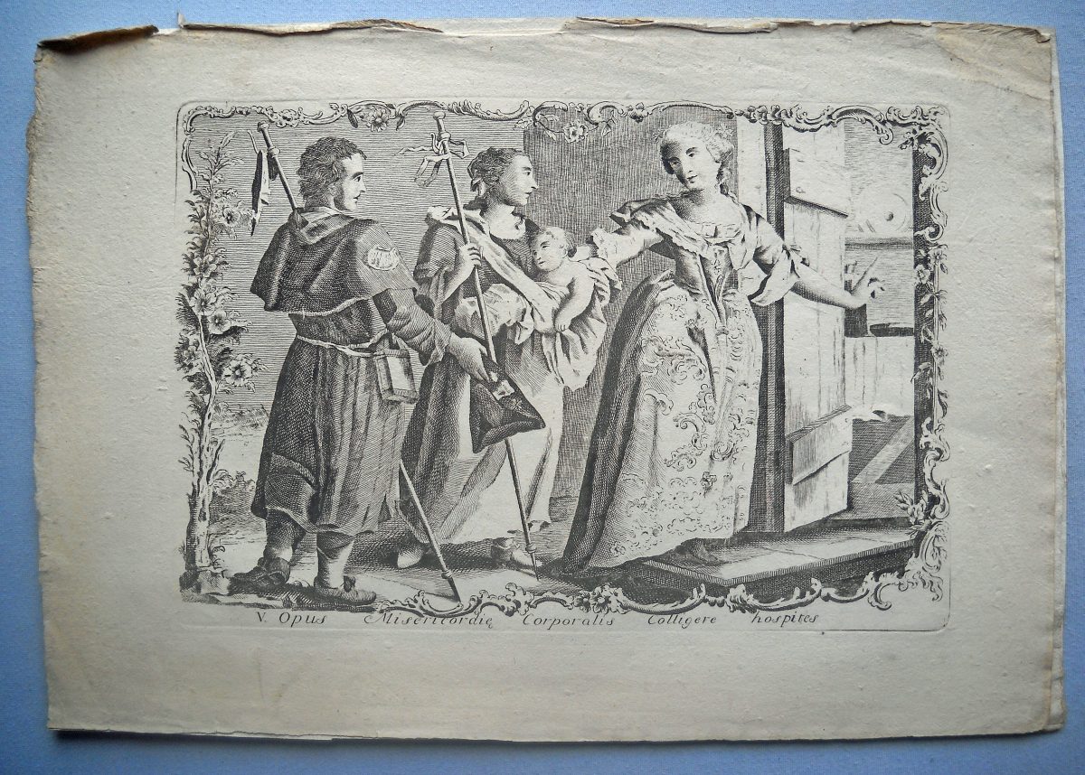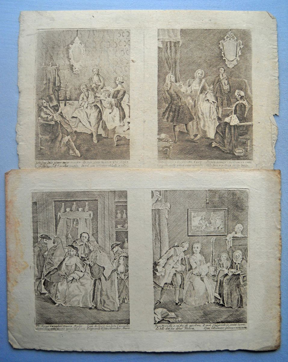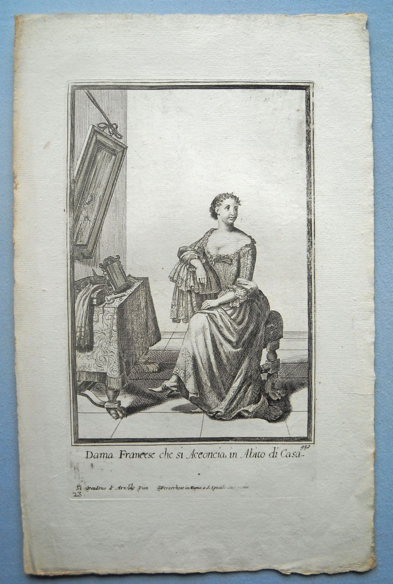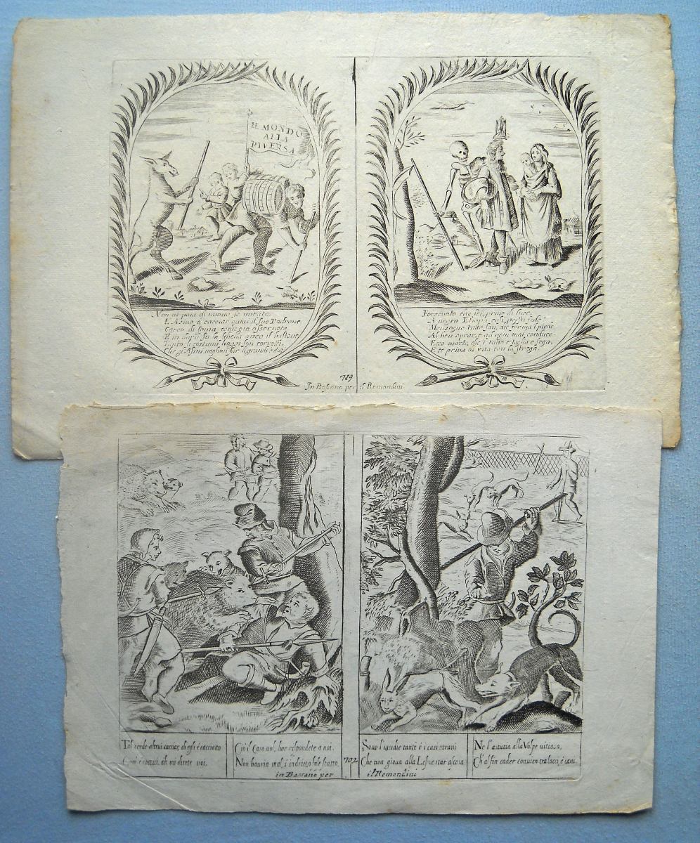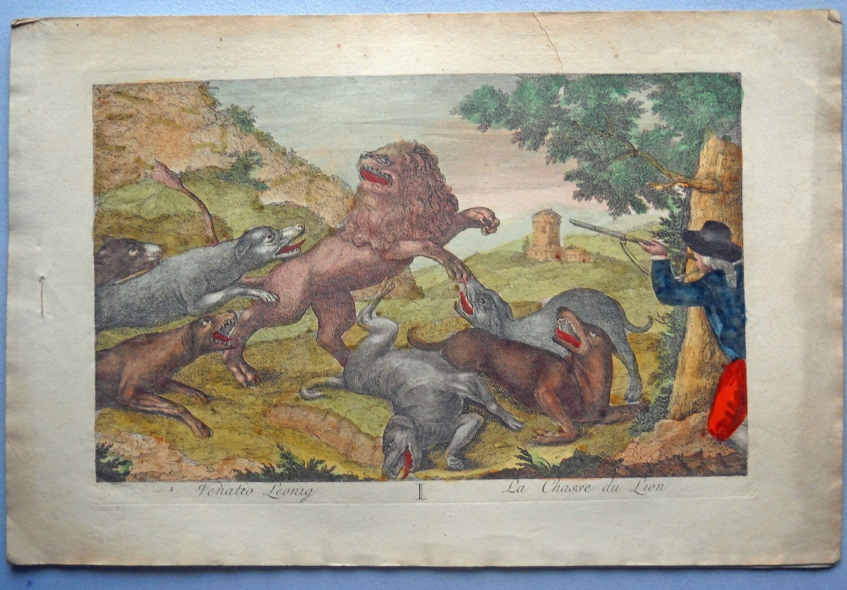 Lot de 53 estampes dont 46 p. gravées en taille-douce sur papier vergé dont 18 à rehauts de coloris d'époque reliées par un point de fil, 39 x 25 cm max., dont: Dama Francese che si Acconcia in Abito di Casa ; Estat et Inverno ; Carlo VI imperatore de Romani ; Cristina Elisabetta imperatrice de Romani ; Don Phelipe de Francia Rey de Espana ; La princesse de Parme Reine de Espana ; les quatorze uvres de miséricorde spirituelles composées de 2 séries de chacune 7 estampes reliées par un point de fil, l'une en noire et l'autre coloriées ; 4 p. de scènes de chasse ; Der Mann als Haubenstock ; etc - 2 épreuves gravées sur bois coloriées, 44 x 33 cm: Il cane Barbino ; Il gatto Domestico - 5 lithographies. La plupart des estampes éditées par la maison Remondini.