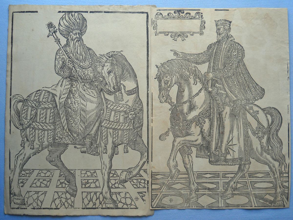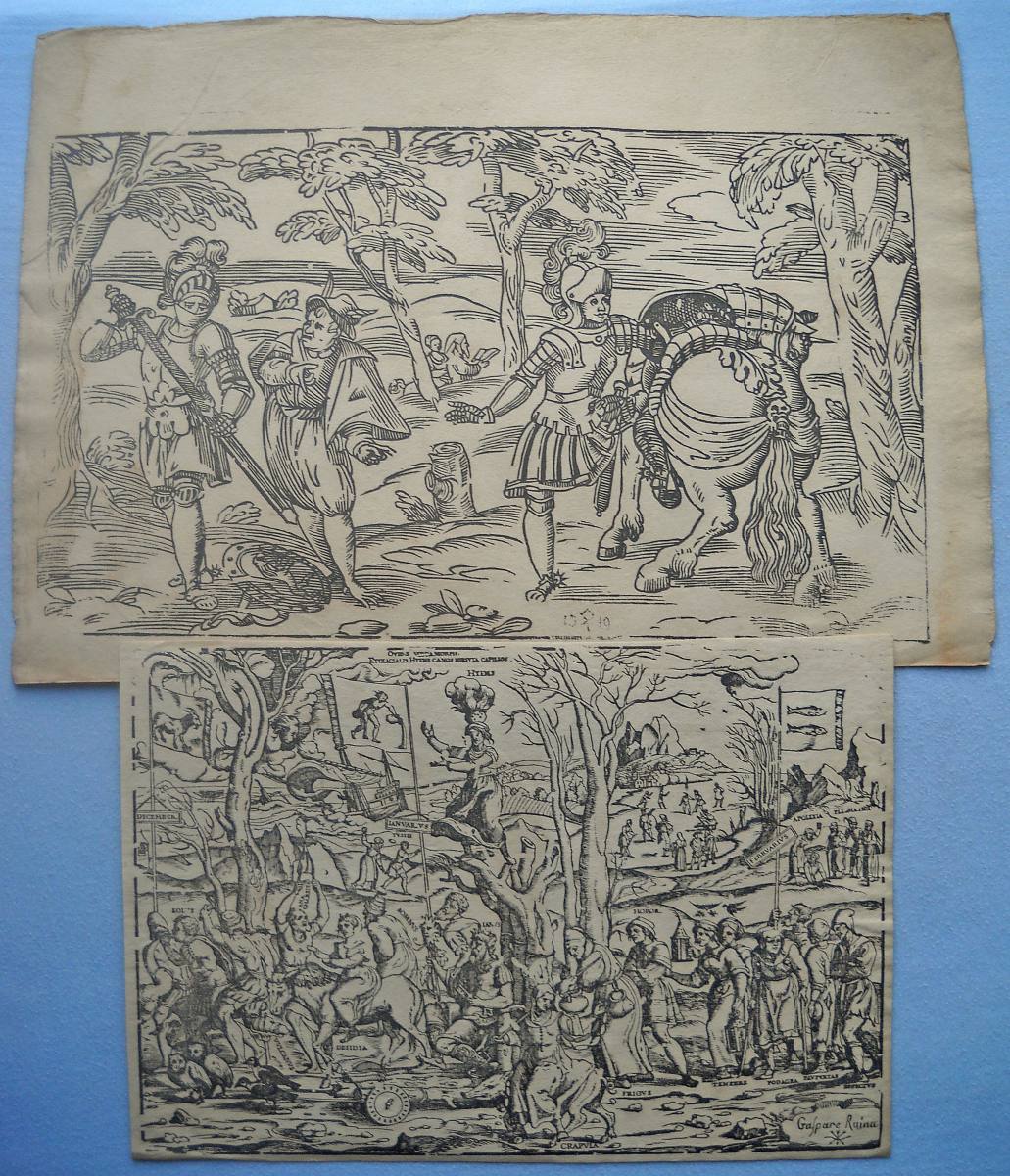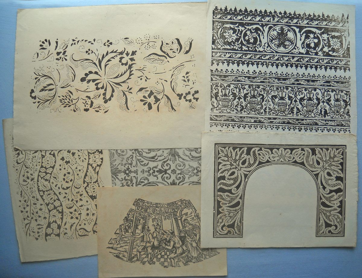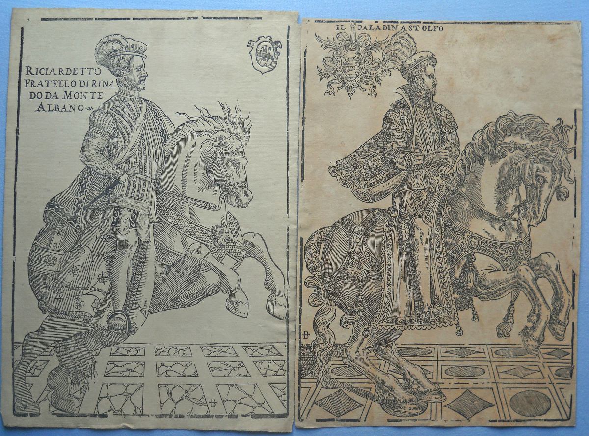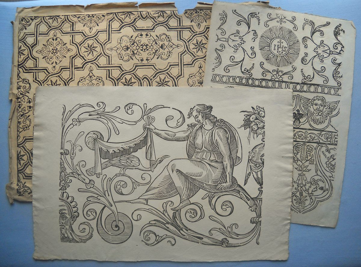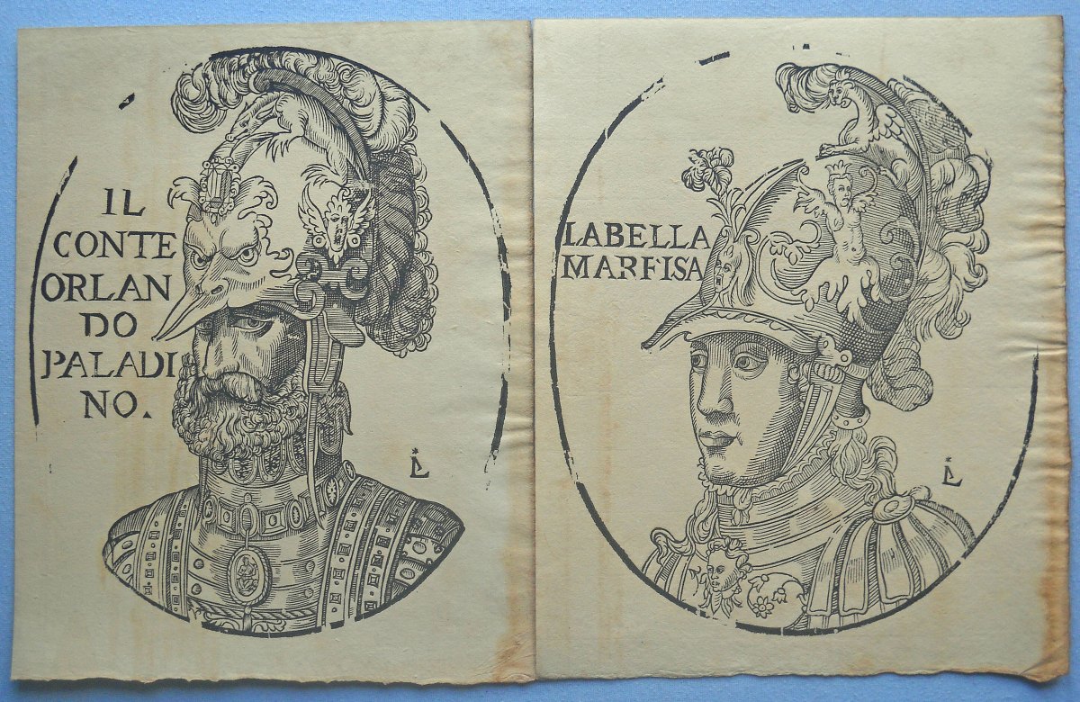 Lot de + de 40 épreuves gravées sur bois, la plupart sur papier vergé, petits et grands formats (in-12 à grand in-fol.). Réimpressions de bois anciens des XVIe, XVIIe et XVIIIe siècles, en majorité des uvres d'artistes italiens, dont planches de décorations pour ornementation de couvertures de caissons, tapisseries ; sujet d'éventail ; Arboro di frutti della fortuna [L'Arbre de la Liberté] ; Il moro e la mora ; Soltan Charadi ditto Barbarossa re d'Algeri ; Il paladin Astolfo ; Il conte Orlando Paladino ; La Bella Marfisa ; Riciardetto Fratello Dirina Doda Monte Albano, etc.