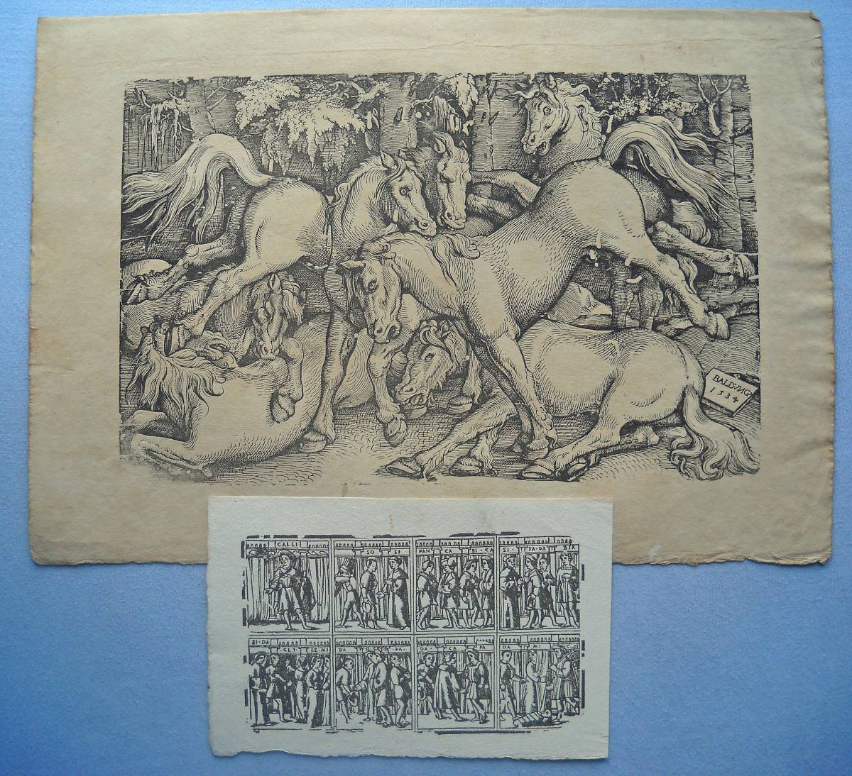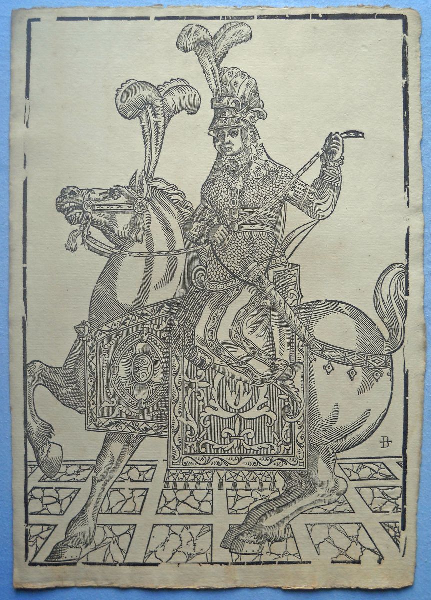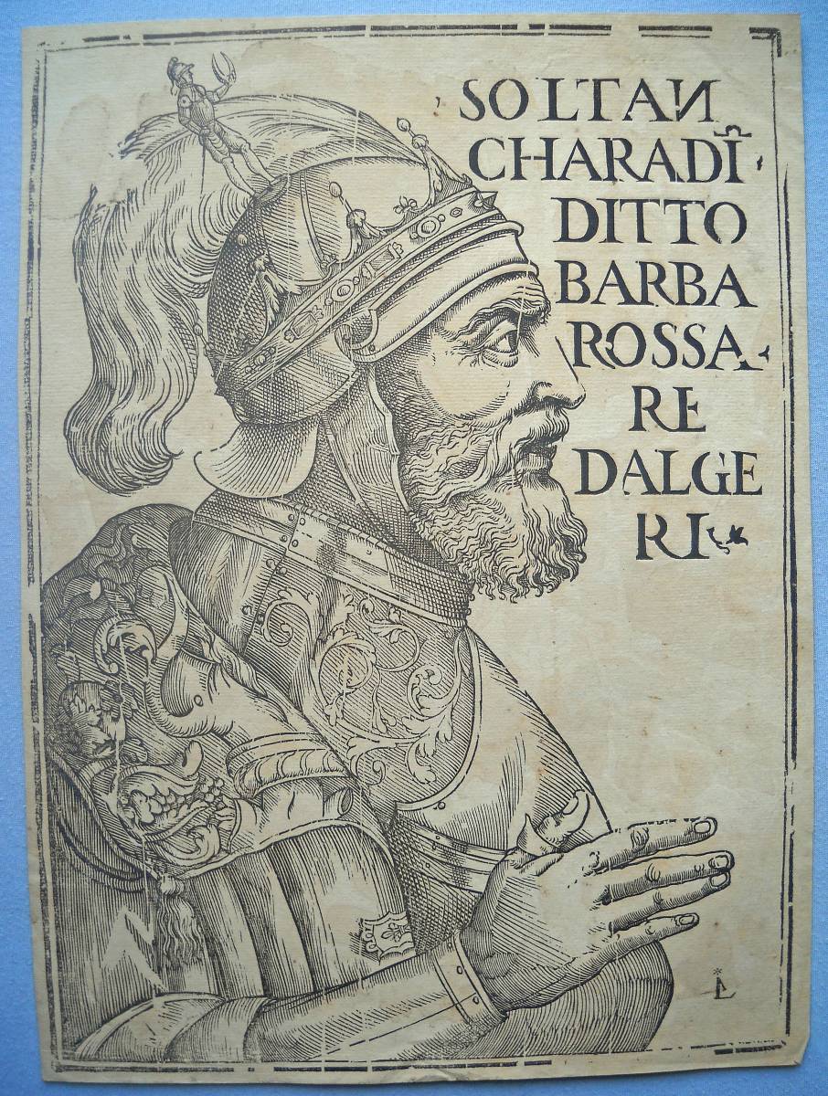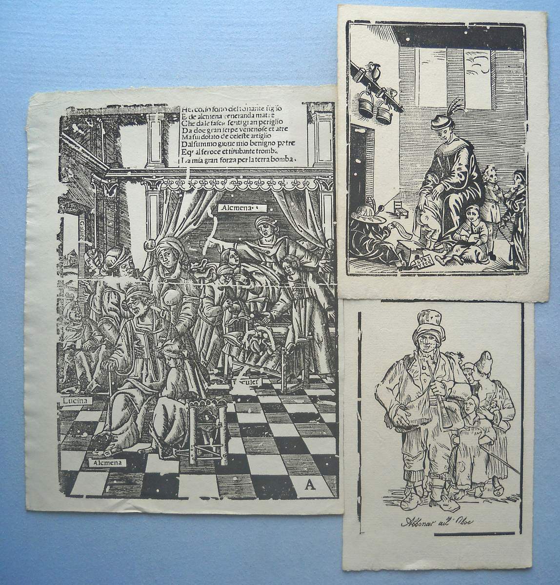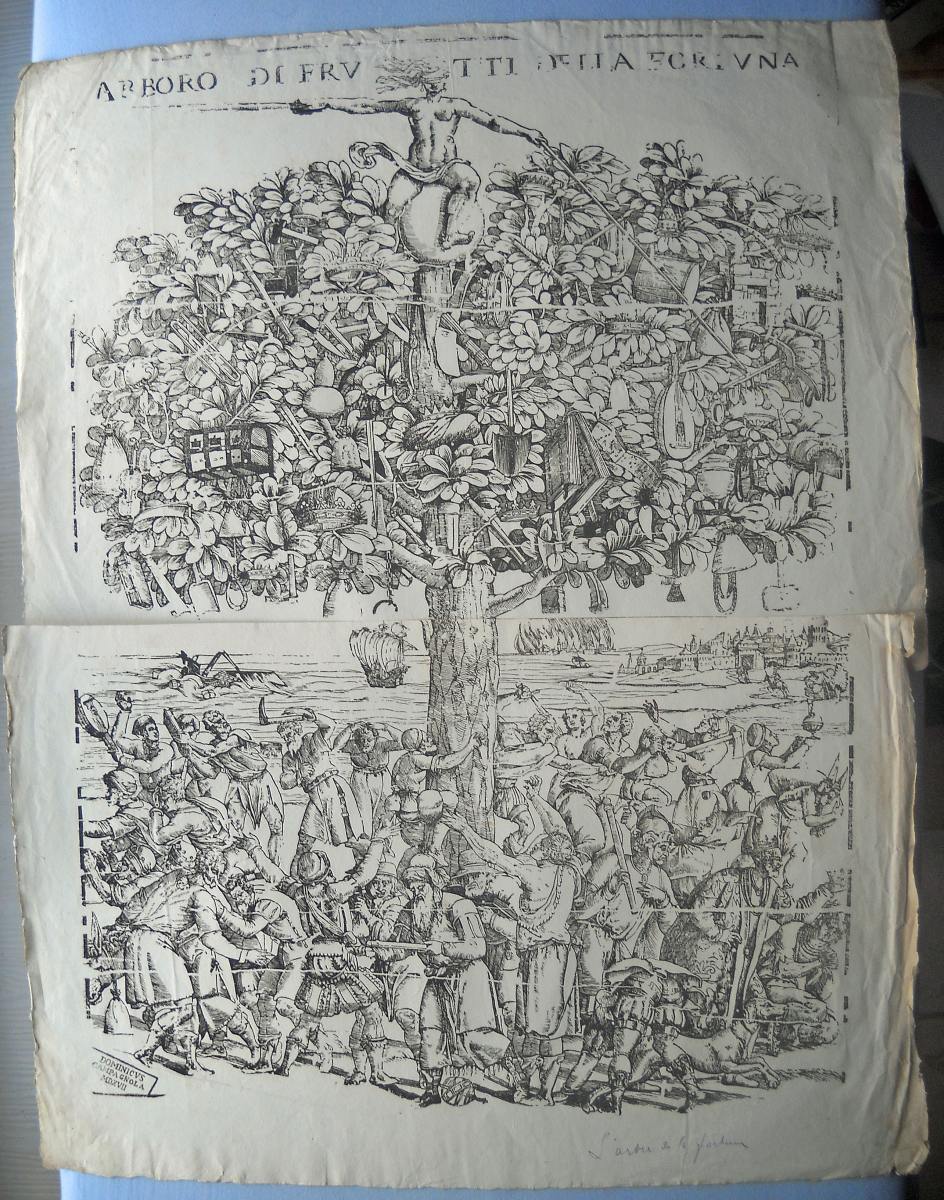 Lot de + de 40 épreuves gravées sur bois, la plupart sur papier vergé, petits et grands formats (in-12 à grand in-fol.). Réimpressions de bois anciens des XVIe, XVIIe et XVIIIe siècles, en majorité des uvres d'artistes italiens, dont planches de décorations pour ornementation de couvertures de caissons, tapisseries ; sujet d'éventail ; Arboro di frutti della fortuna [L'Arbre de la Liberté] ; Il moro e la mora ; Soltan Charadi ditto Barbarossa re d'Algeri ; Il paladin Astolfo ; Il conte Orlando Paladino ; La Bella Marfisa ; Riciardetto Fratello Dirina Doda Monte Albano, etc.