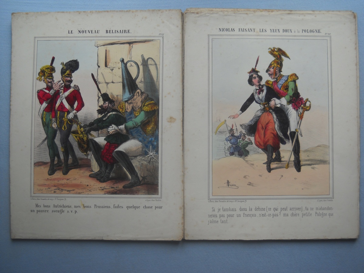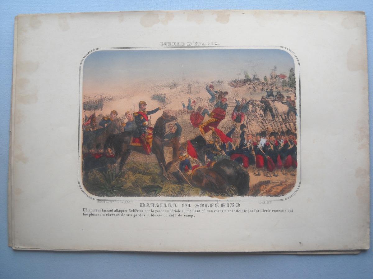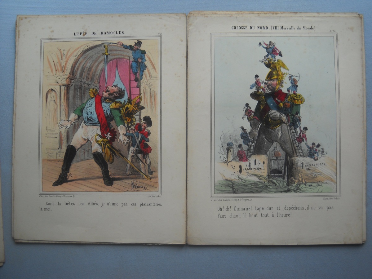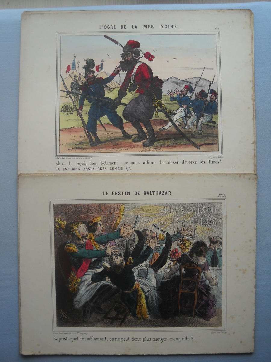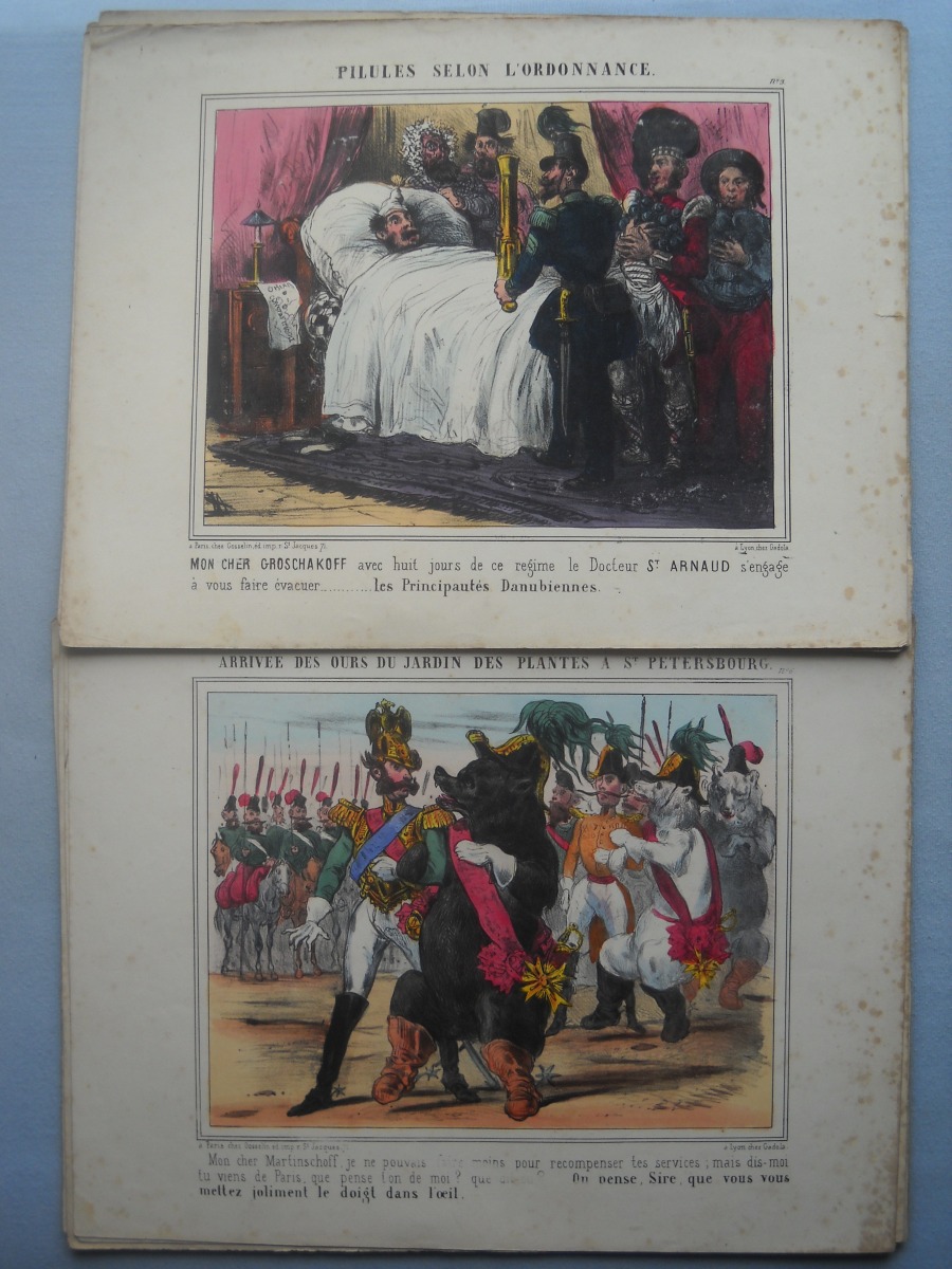Lot de + de 65 estampes lithographiées à rehauts de couleurs, certaines tamponnées au dos de l'autorisation de colportage, dont: 35 ex. signées A. Adam, parodiant la Russie durant la guerre de Crimée (1853-1856), 36 x 28 cm ; 10 ex. illustrant les batailles de la guerre d'Italie (1859), 31 x 46 cm ; sujets enfantins ; La chasse au crocodile ; La France proclamant la liberté ; La prospérité de la France ; Le baiser à la capucine ; La fête à la Madône ; Les moissonneurs dans les marais pontins ; etc. Rousseurs, petits défauts en marge.