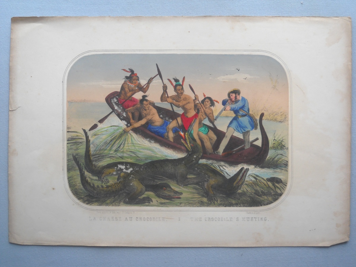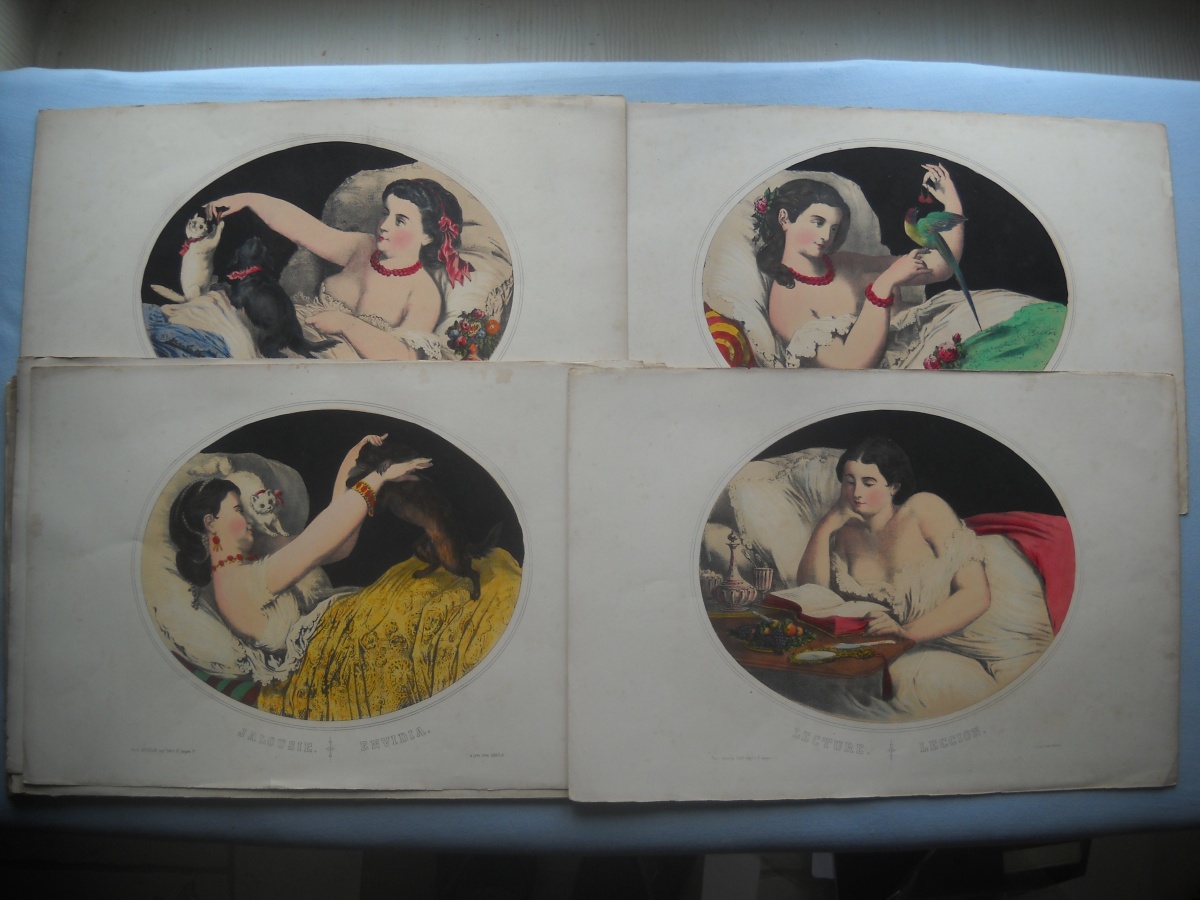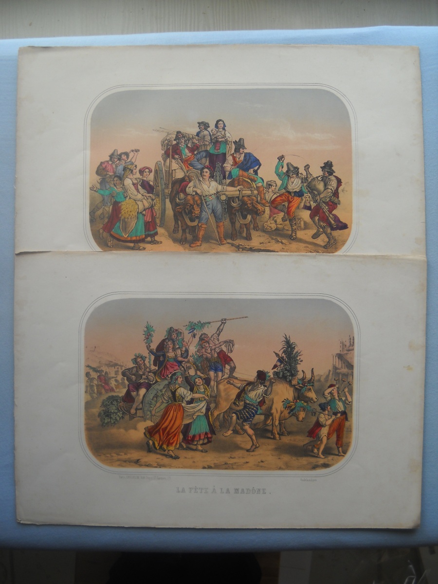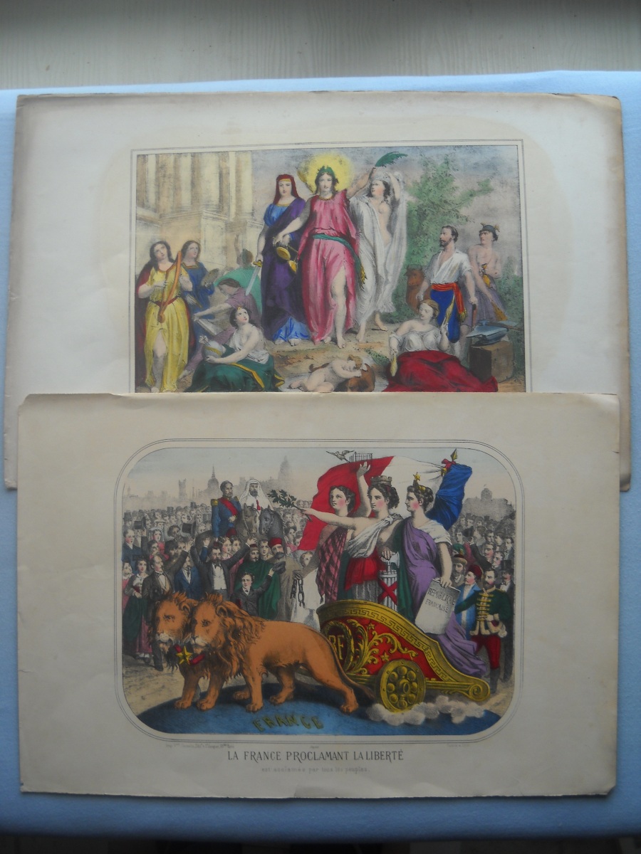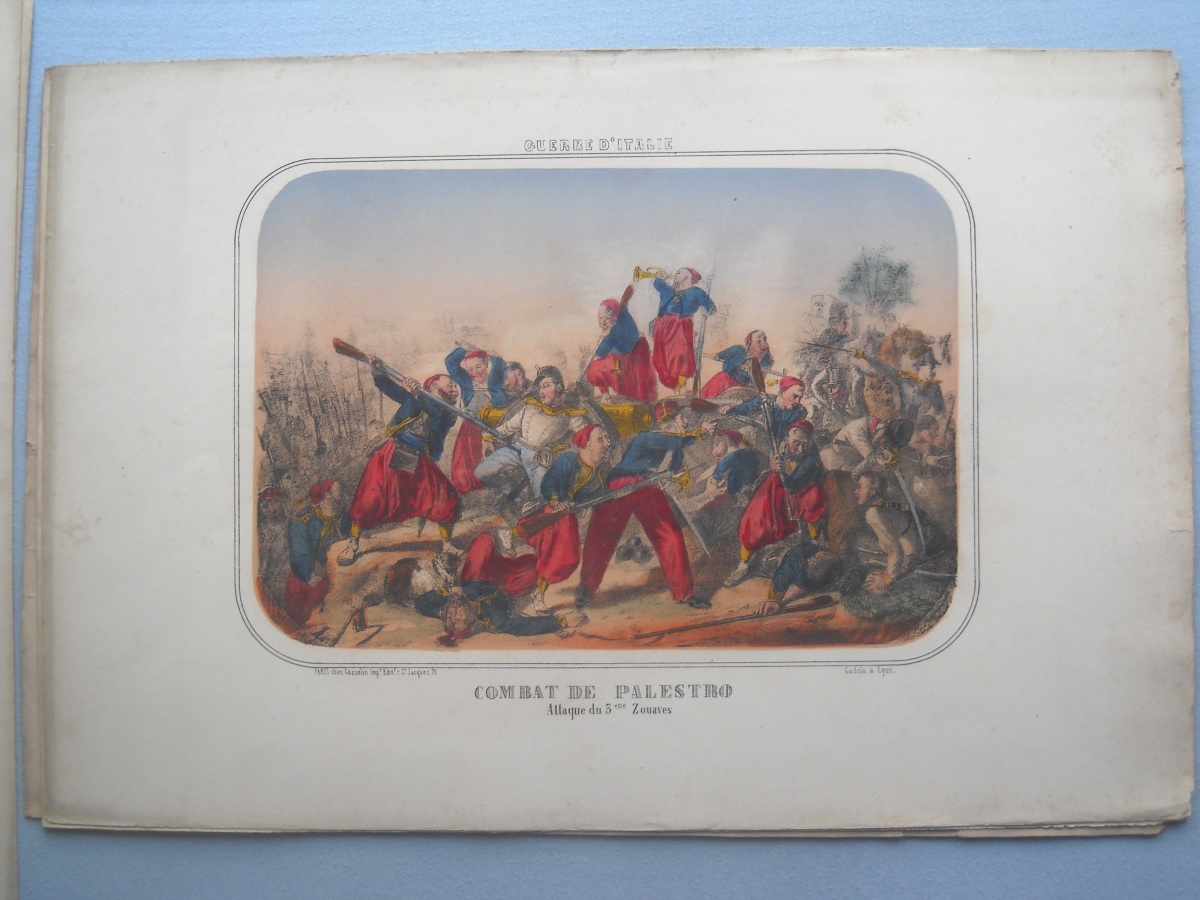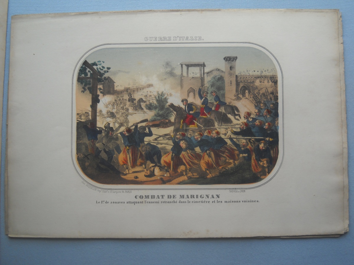Lot de + de 65 estampes lithographiées à rehauts de couleurs, certaines tamponnées au dos de l'autorisation de colportage, dont: 35 ex. signées A. Adam, parodiant la Russie durant la guerre de Crimée (1853-1856), 36 x 28 cm ; 10 ex. illustrant les batailles de la guerre d'Italie (1859), 31 x 46 cm ; sujets enfantins ; La chasse au crocodile ; La France proclamant la liberté ; La prospérité de la France ; Le baiser à la capucine ; La fête à la Madône ; Les moissonneurs dans les marais pontins ; etc. Rousseurs, petits défauts en marge.