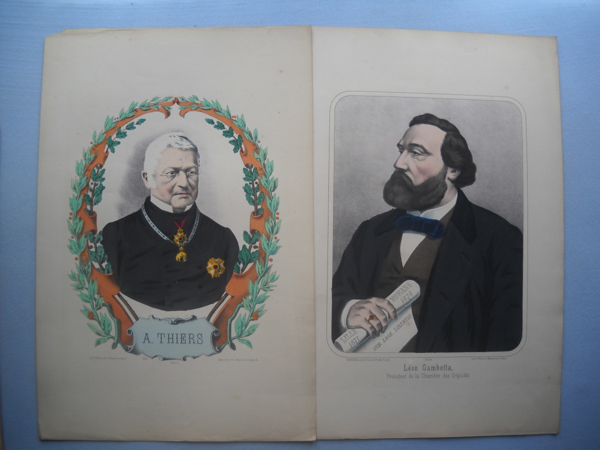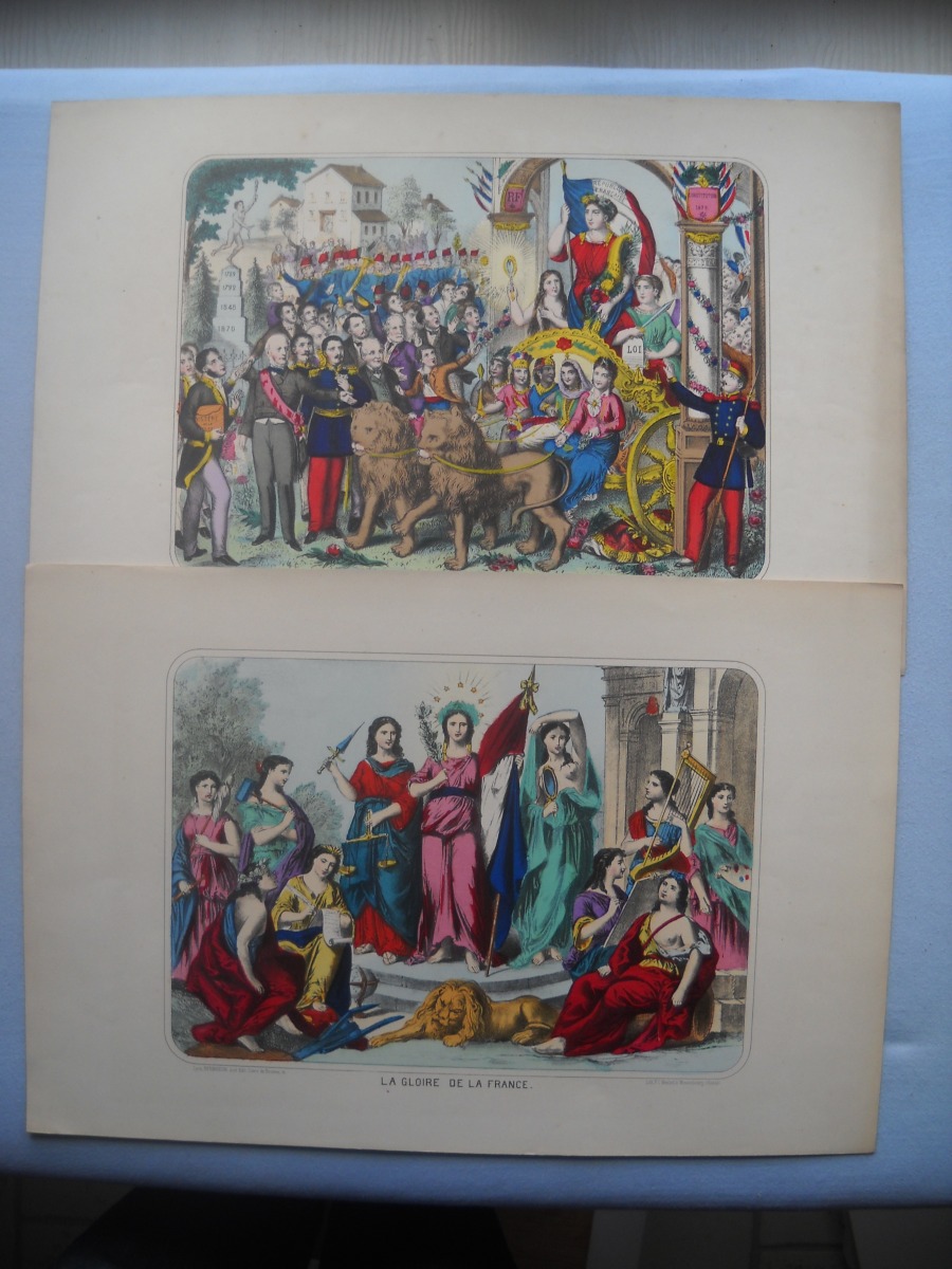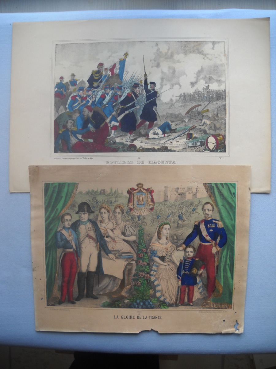 Réunion de + de 55 estampes lithographiées à rehauts de couleurs, éditées par les maisons Wentzel à Wissembourg et par Dembour-Gangel et Gangel-Didion à Metz, env. 30 x 44 cm et inverse, dont: sujets enfantins ; Vaisseau en flammes ; Naufrage ; La République française ; La Gloire de la France ; Joseph Garibaldi et sa famille ; A. Thiers ; Constitution ; Léon Gambetta ; Lorraine ; Bataille de Magenta, etc. Qqs rousseurs et manques. Joint 3 puzzles de jeux enfantins par Wenzel.