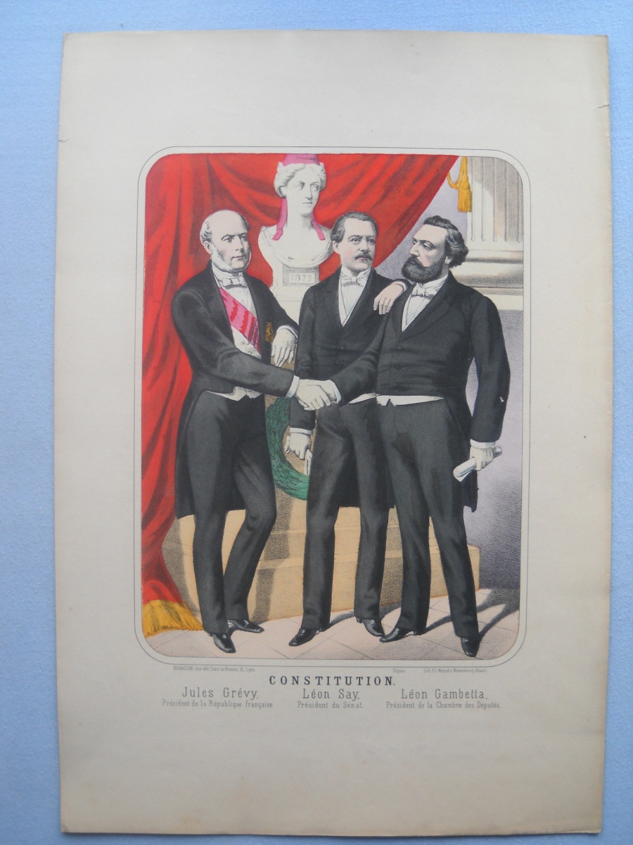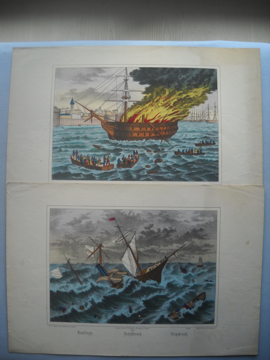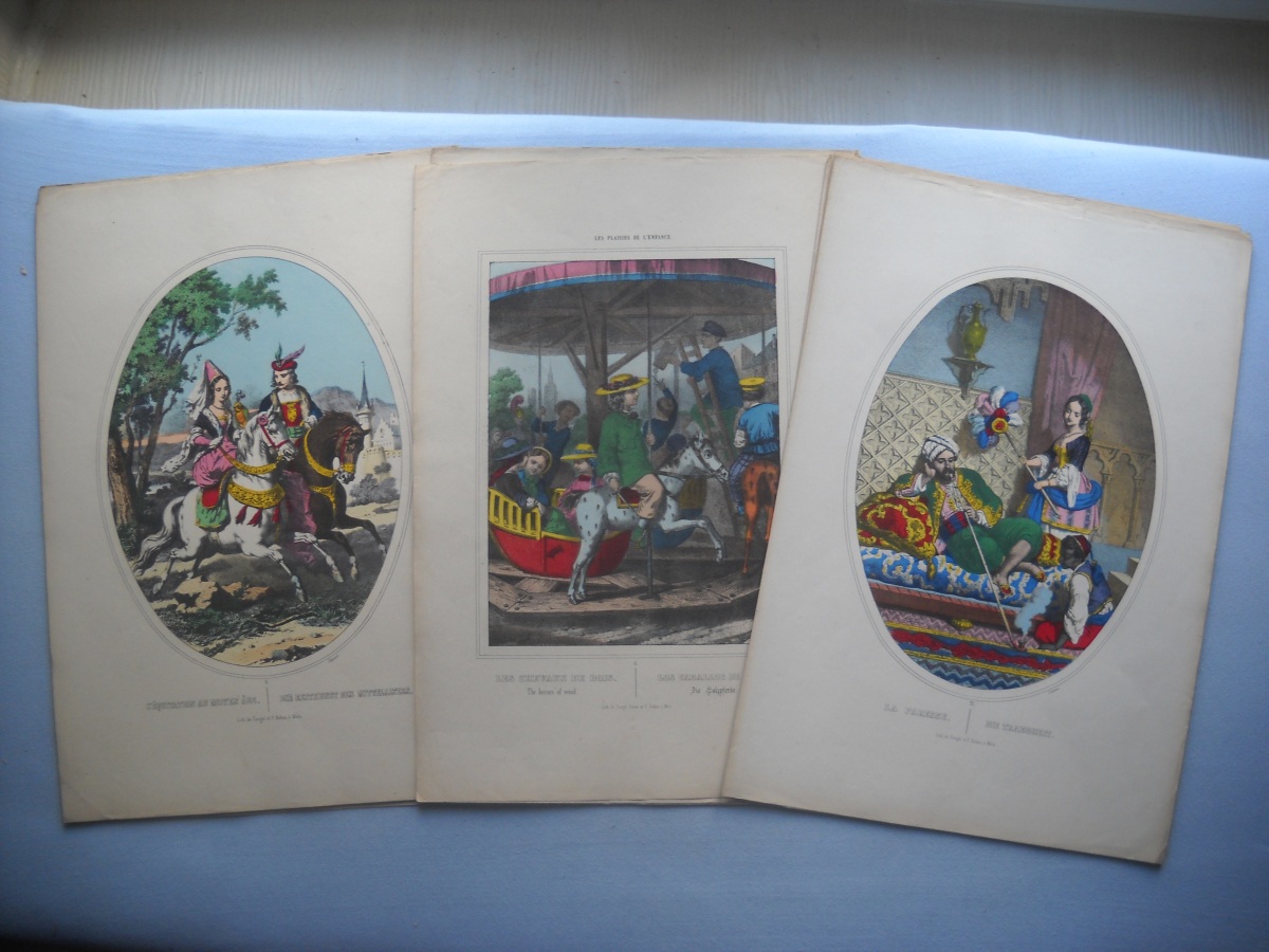Réunion de + de 55 estampes lithographiées à rehauts de couleurs, éditées par les maisons Wentzel à Wissembourg et par Dembour-Gangel et Gangel-Didion à Metz, env. 30 x 44 cm et inverse, dont: sujets enfantins ; Vaisseau en flammes ; Naufrage ; La République française ; La Gloire de la France ; Joseph Garibaldi et sa famille ; A. Thiers ; Constitution ; Léon Gambetta ; Lorraine ; Bataille de Magenta, etc. Qqs rousseurs et manques. Joint 3 puzzles de jeux enfantins par Wenzel.