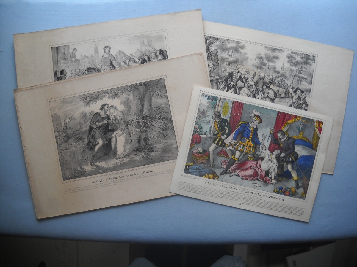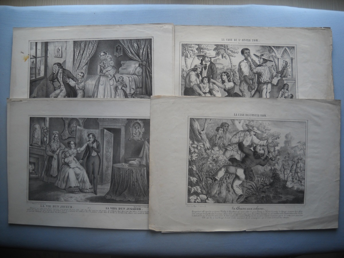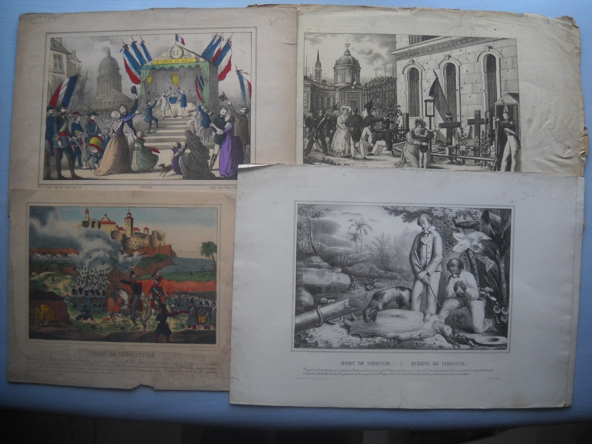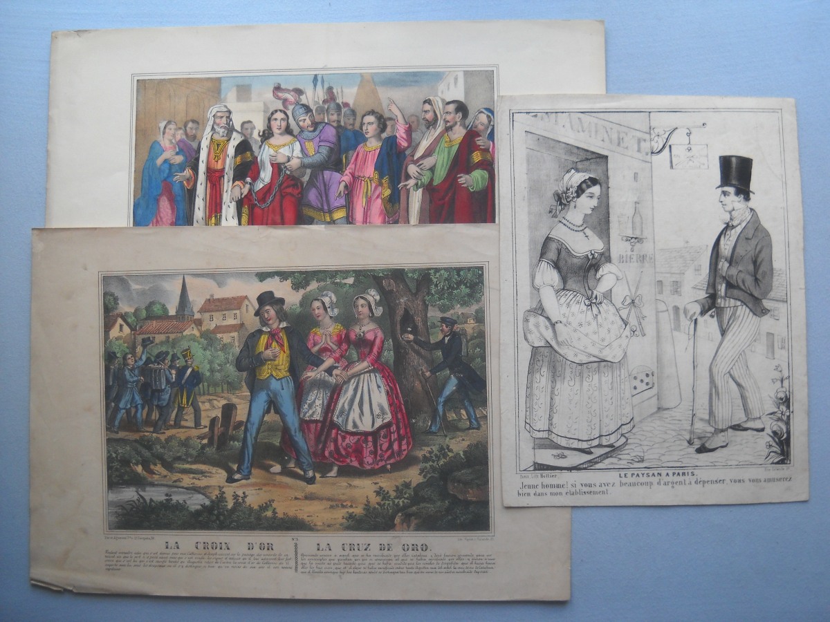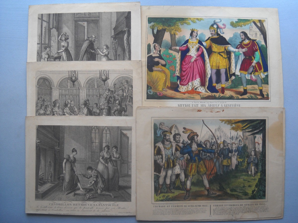 Lot de + de 55 estampes gravées en taille-douce ou lithographiées, la plupart rehaussées de coloris d'époque, éditées par les maisons Turgis, Agustoni, Cerghetti, Bès et Dubreuil, Hollier, Basset, Léotaud, Mourgue, Boulard, Noël, Miné, etc. Quelques planches tirées de la Romance d'Héloïse ; Cendrillon ; Guillaume Tell ; Paul et Virginie ; la vie d'un joueur ; la case de l'oncle Tom ; etc. Mauvais état à B.E.