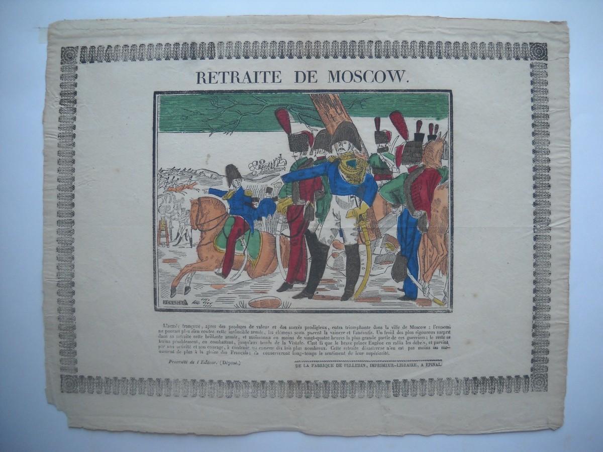 5 épreuves, gravure sur bois coloriée au pochoir, montées sur papier épais: Retraite de Moscow, gravée par Réveillé, 31,5 x 41,5 cm [ca 1812-1815] ; S.A.R. Madame la duchesse de Berry, gravée par Canivet fils, 41,5 x 31,5 cm [ca 1816-1822] ; Degrés des âges, 30 x 43 cm [ca avant 1822] ; Mort et convoi de l'invincible Malborough, 42,5 x 32 cm [ca 1825] ; Histoire de Damon et Henriette, 41 x 65 cm [ca 1828].