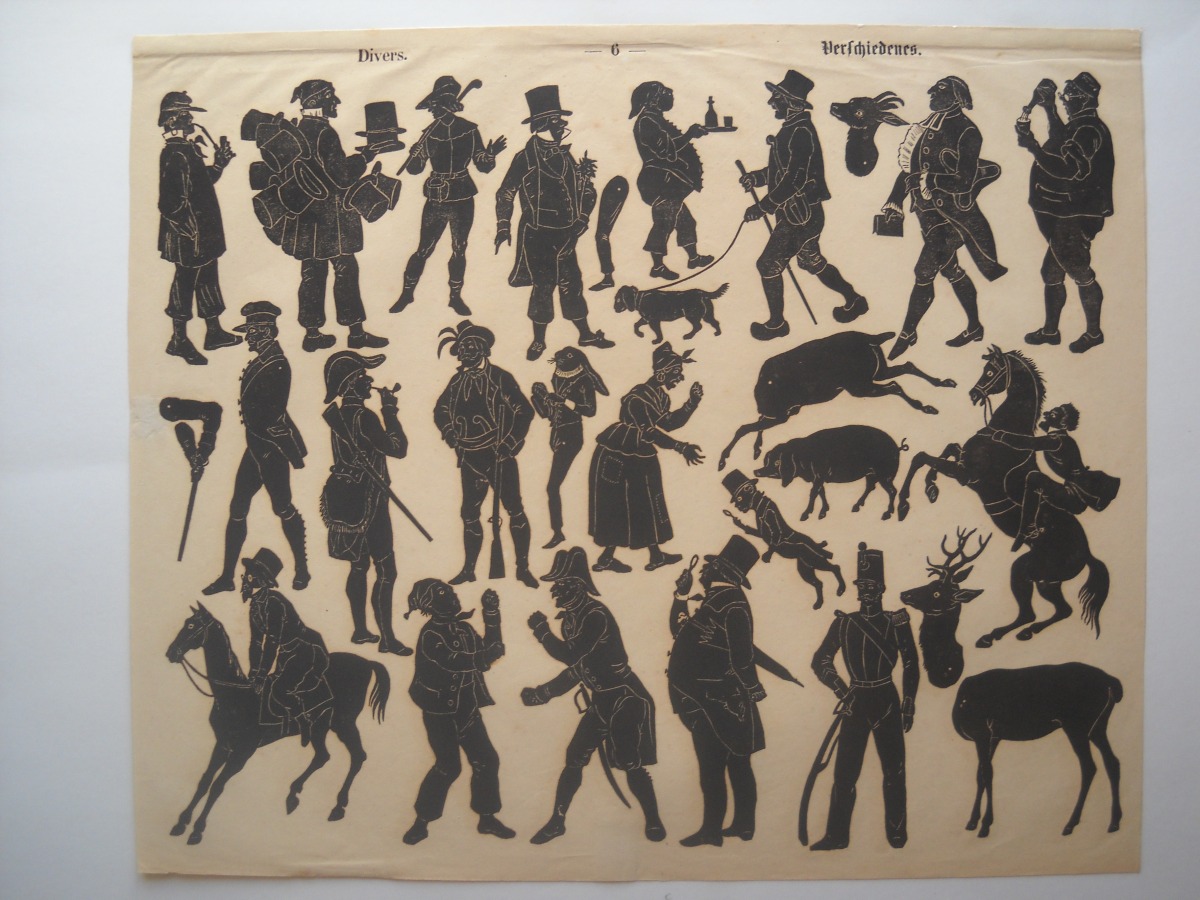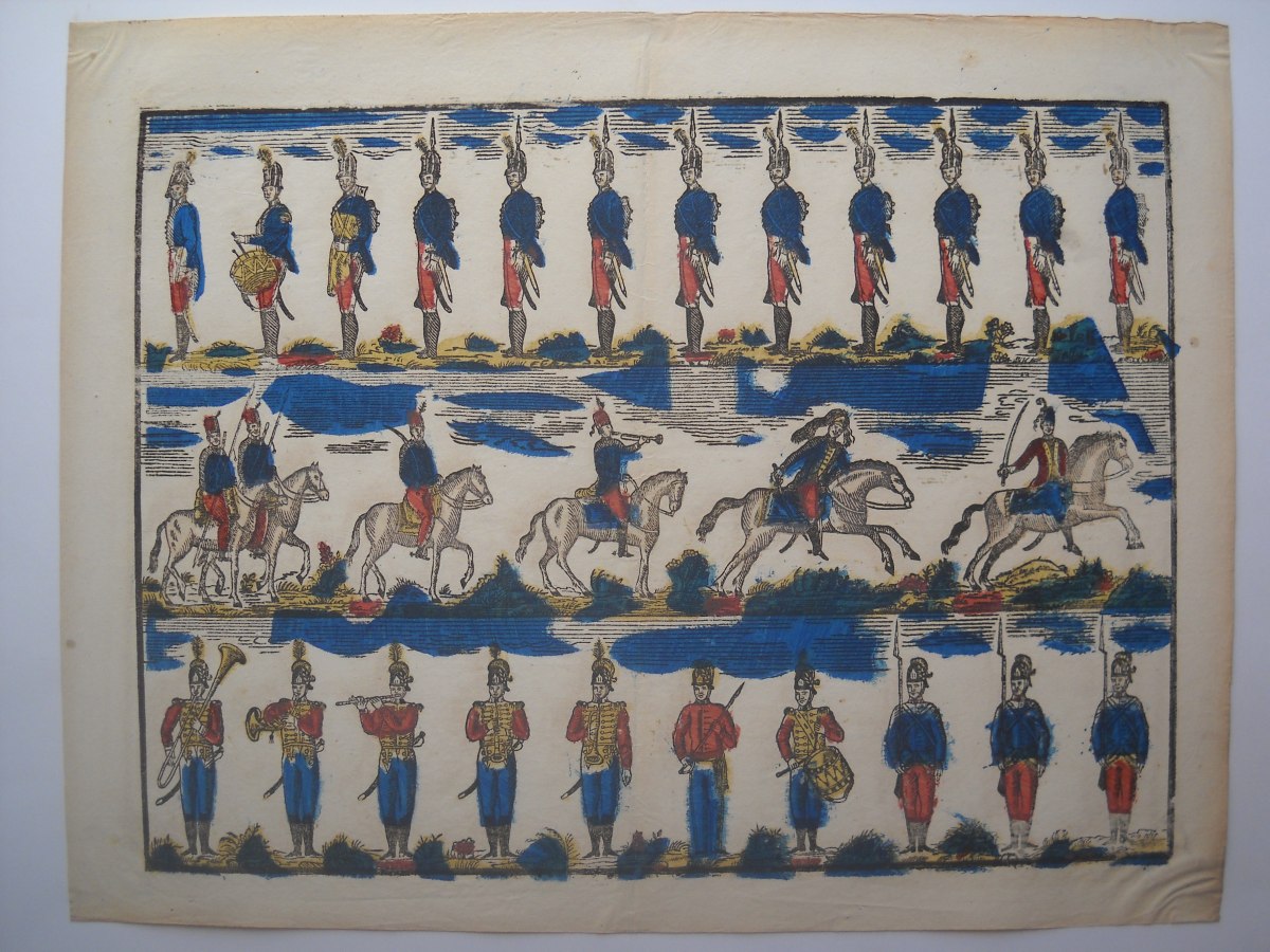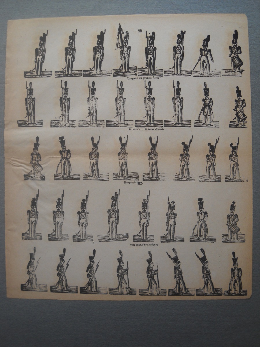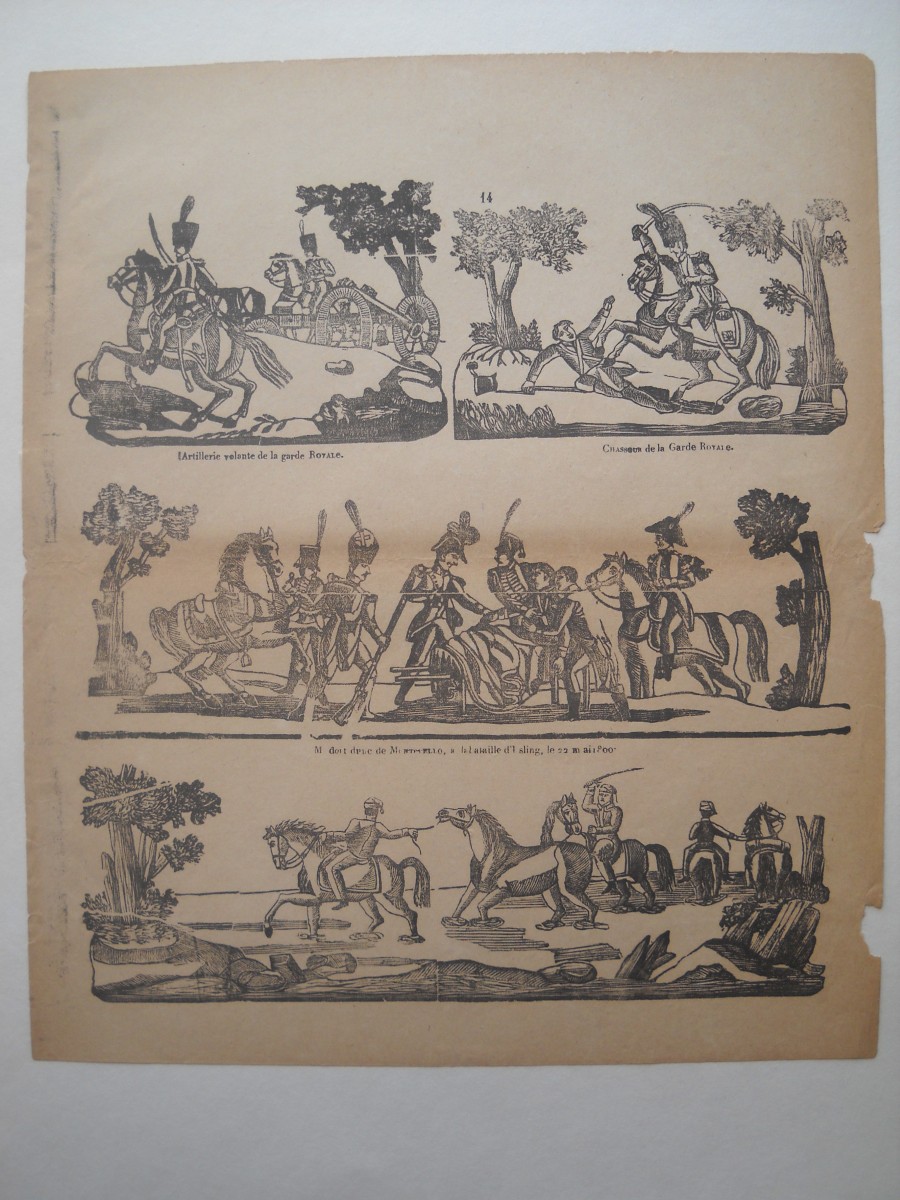 Réunion de 22 épreuves, gravure sur bois ou lithographie, certaines à rehauts de couleurs, toutes dimensions, la plupart montées sur papier épais, dont: Adolescence de Paul et Virginie ; planches à registres de militaires ; planche à compartiments (5x4) de soldats de l'époque napoléonienne (en l'état) ; planche de silhouettes ; histoire de fées et de peau d'Ane ; Das wahre Porträt des ewigen Juden ; Le plaisir des vendanges ; etc. Mauvais état à T.B.E.