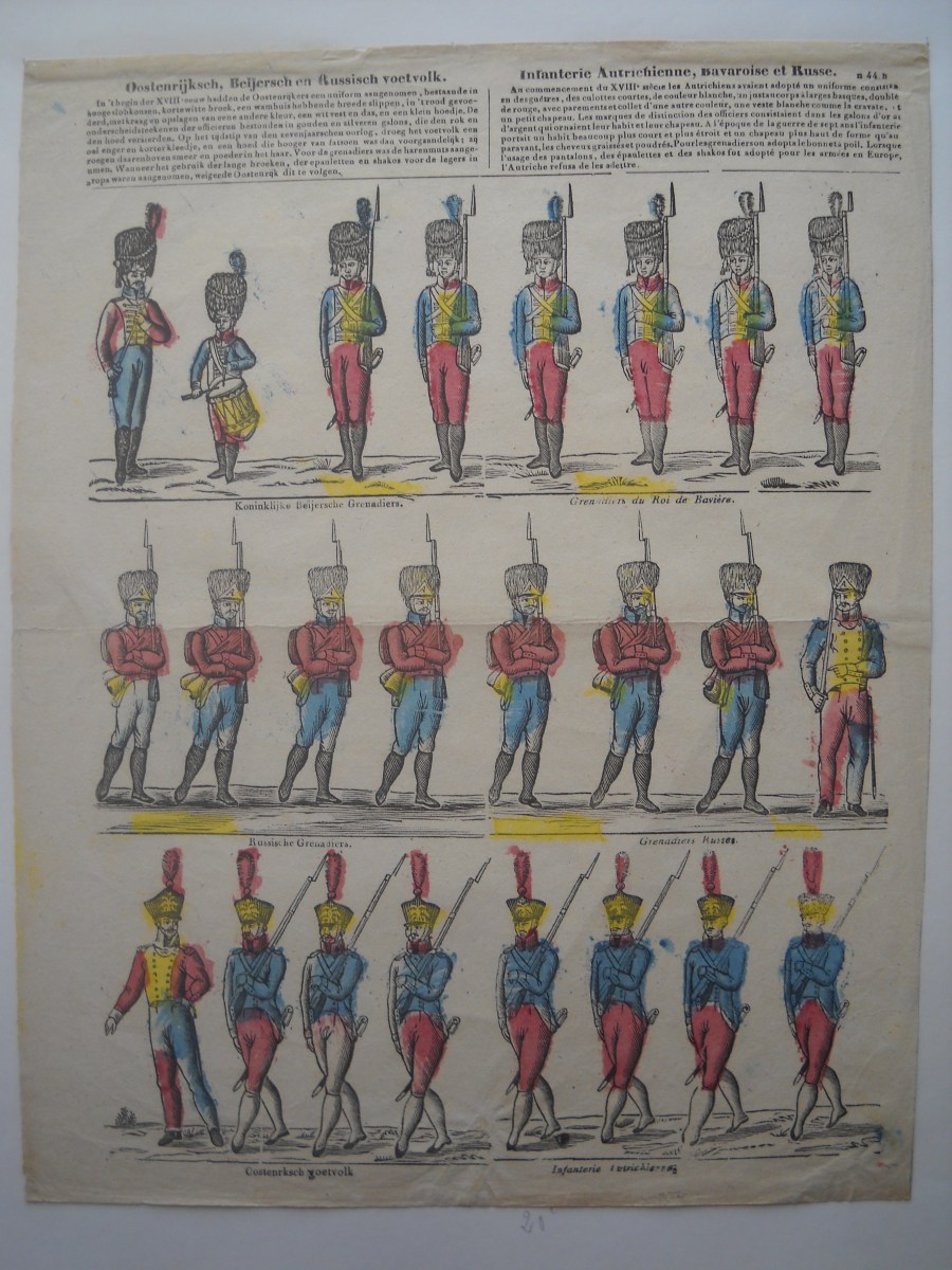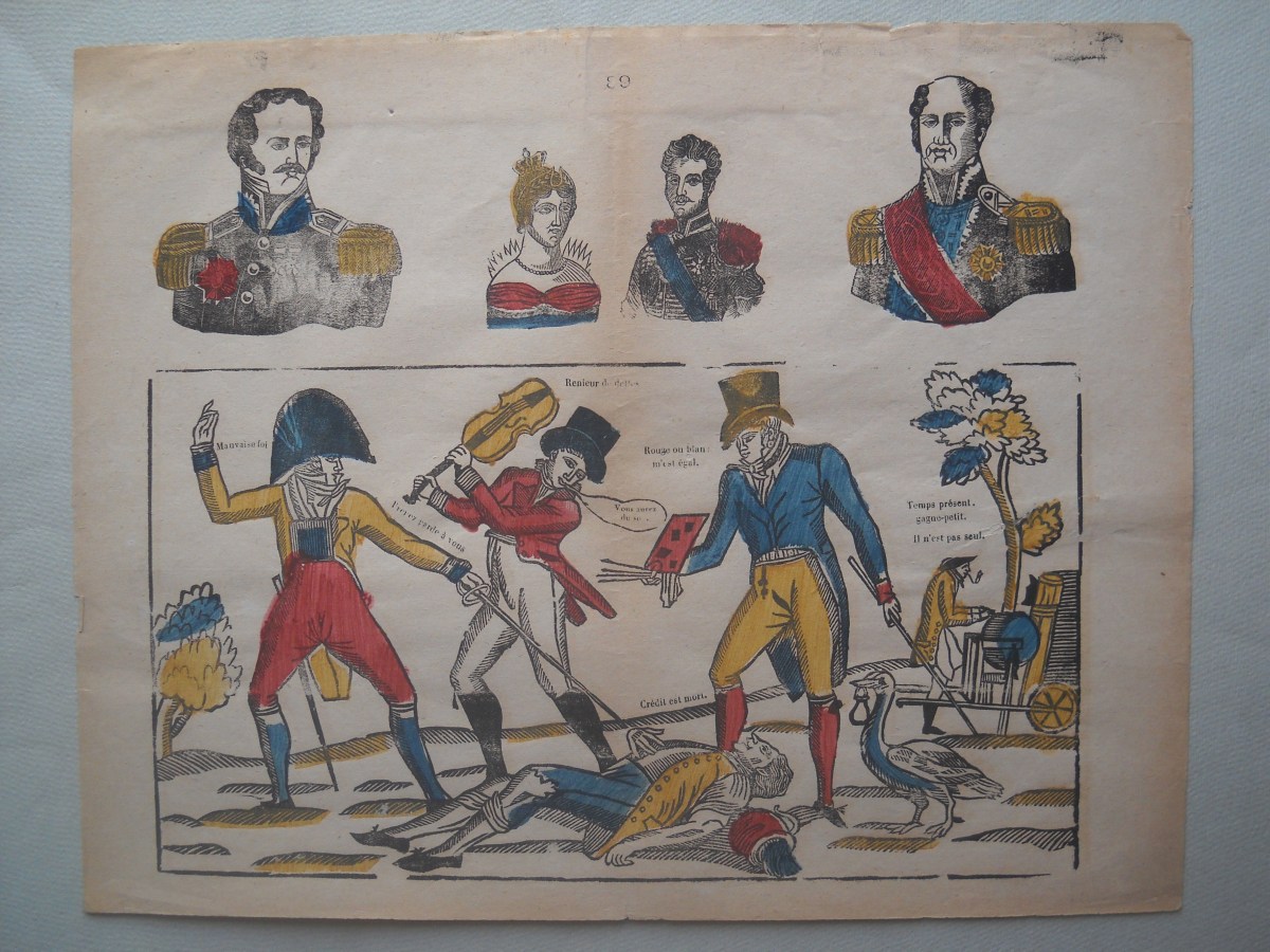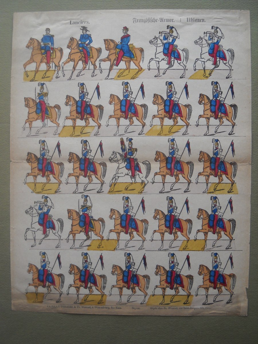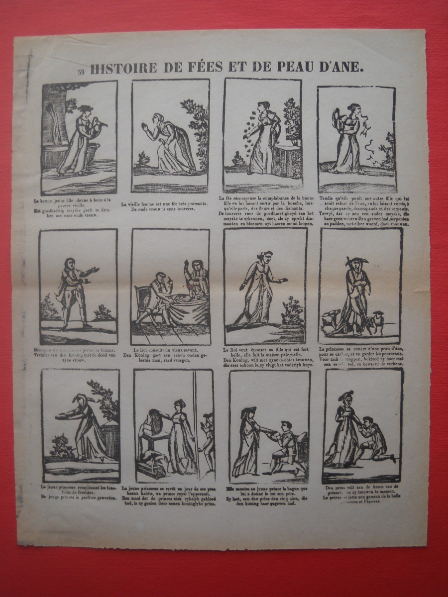 Réunion de 22 épreuves, gravure sur bois ou lithographie, certaines à rehauts de couleurs, toutes dimensions, la plupart montées sur papier épais, dont: Adolescence de Paul et Virginie ; planches à registres de militaires ; planche à compartiments (5x4) de soldats de l'époque napoléonienne (en l'état) ; planche de silhouettes ; histoire de fées et de peau d'Ane ; Das wahre Porträt des ewigen Juden ; Le plaisir des vendanges ; etc. Mauvais état à T.B.E.