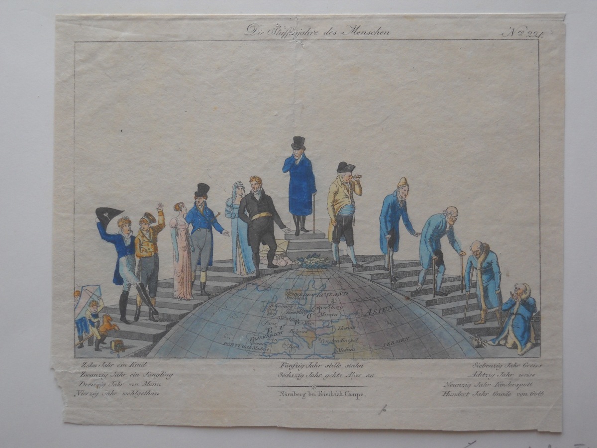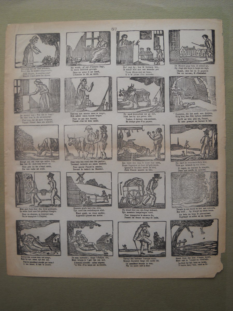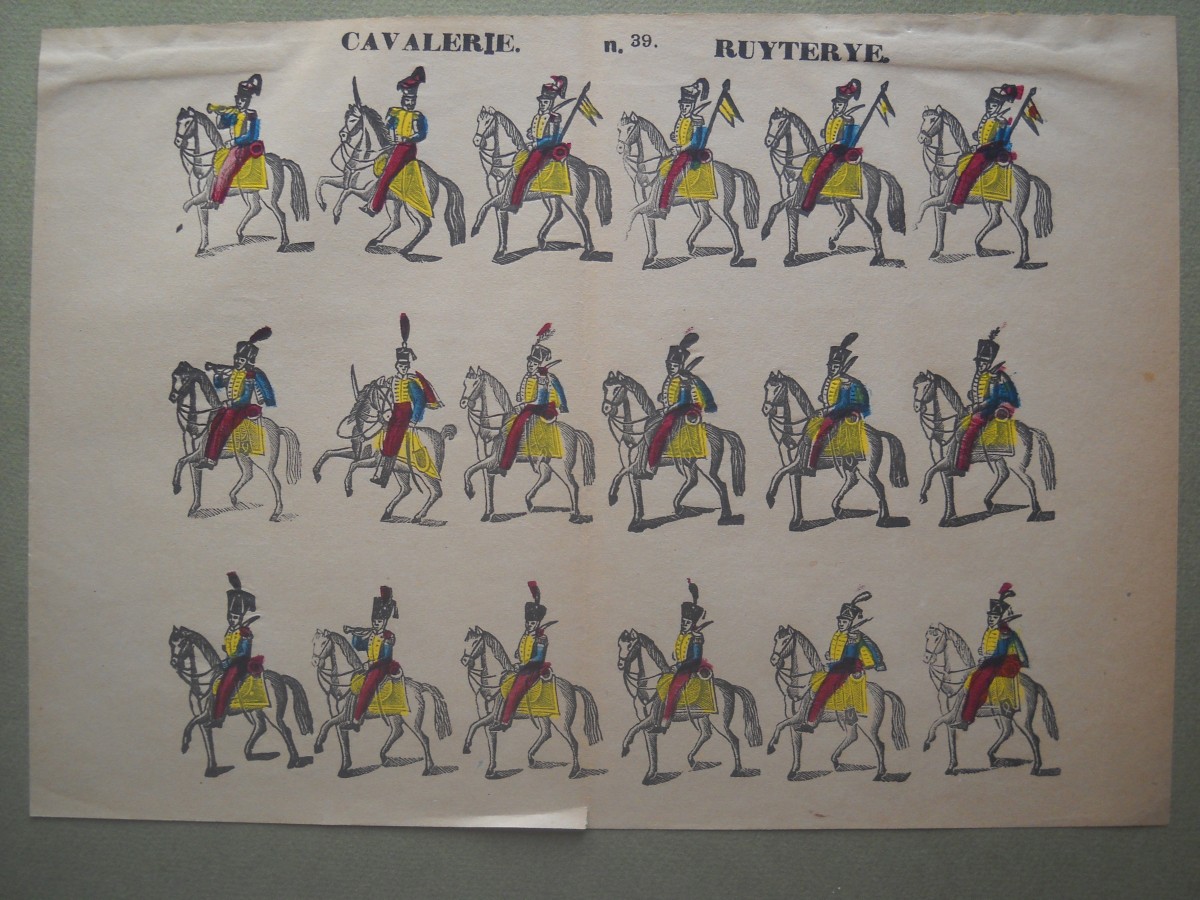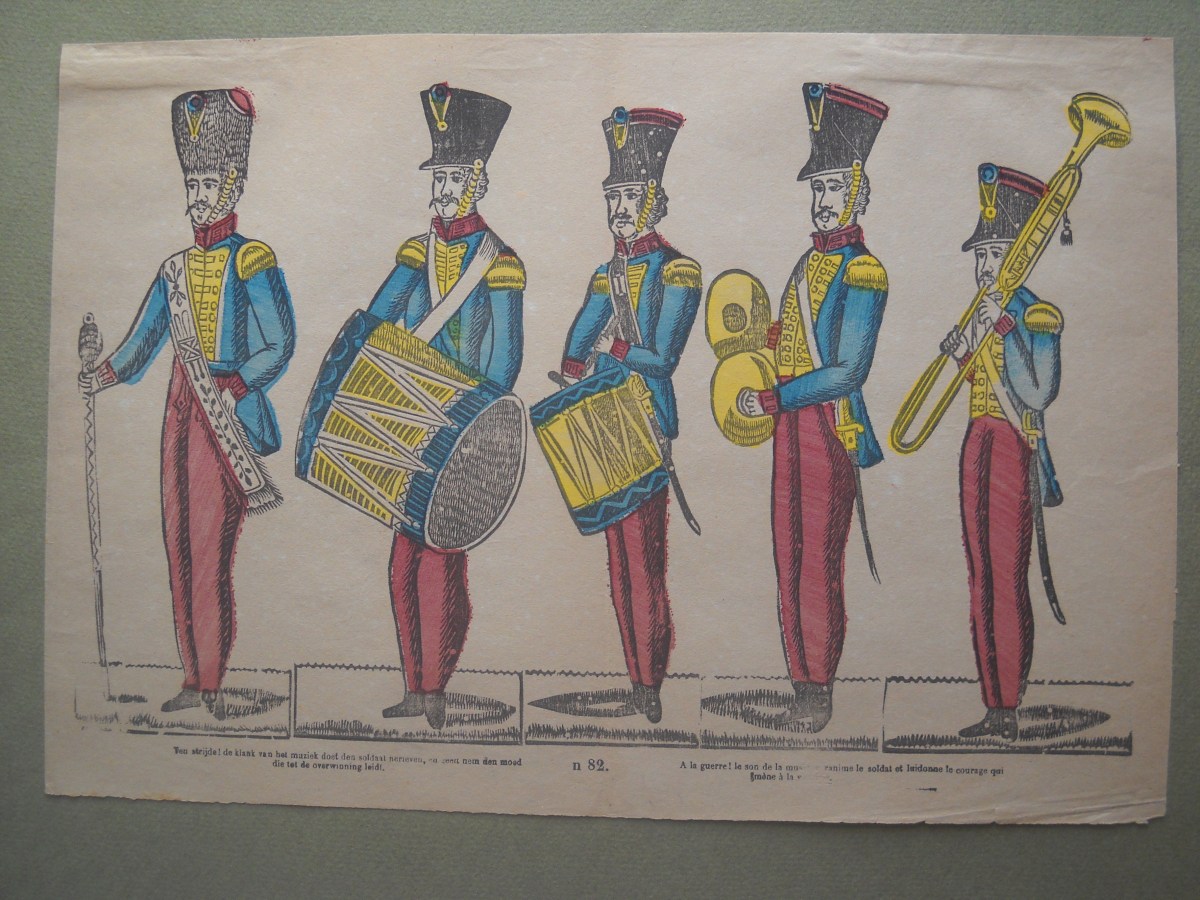 Réunion de 22 épreuves, gravure sur bois ou lithographie, certaines à rehauts de couleurs, toutes dimensions, la plupart montées sur papier épais, dont: Adolescence de Paul et Virginie ; planches à registres de militaires ; planche à compartiments (5x4) de soldats de l'époque napoléonienne (en l'état) ; planche de silhouettes ; histoire de fées et de peau d'Ane ; Das wahre Porträt des ewigen Juden ; Le plaisir des vendanges ; etc. Mauvais état à T.B.E.
