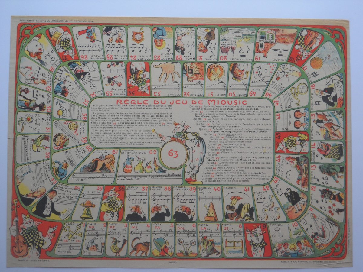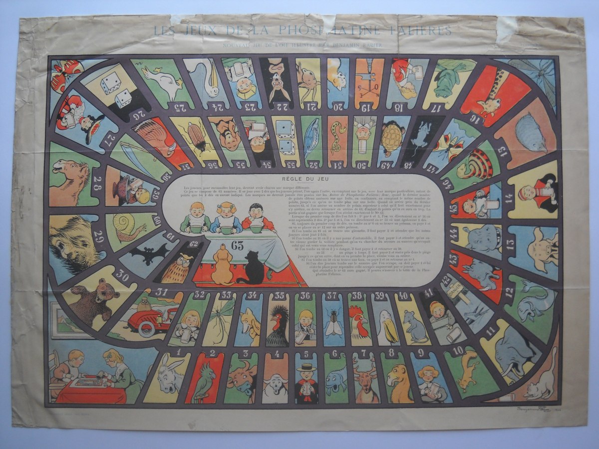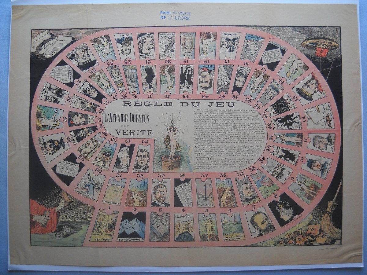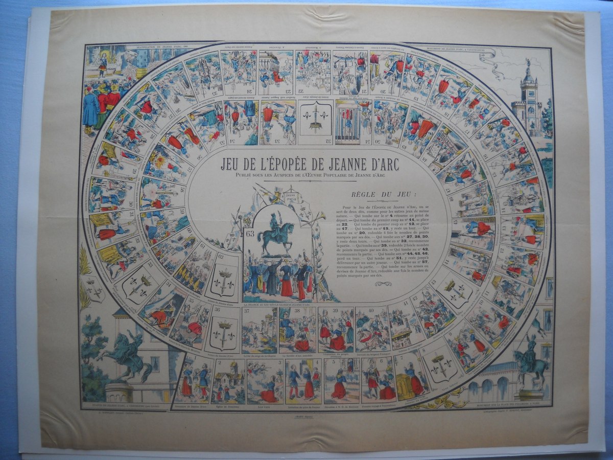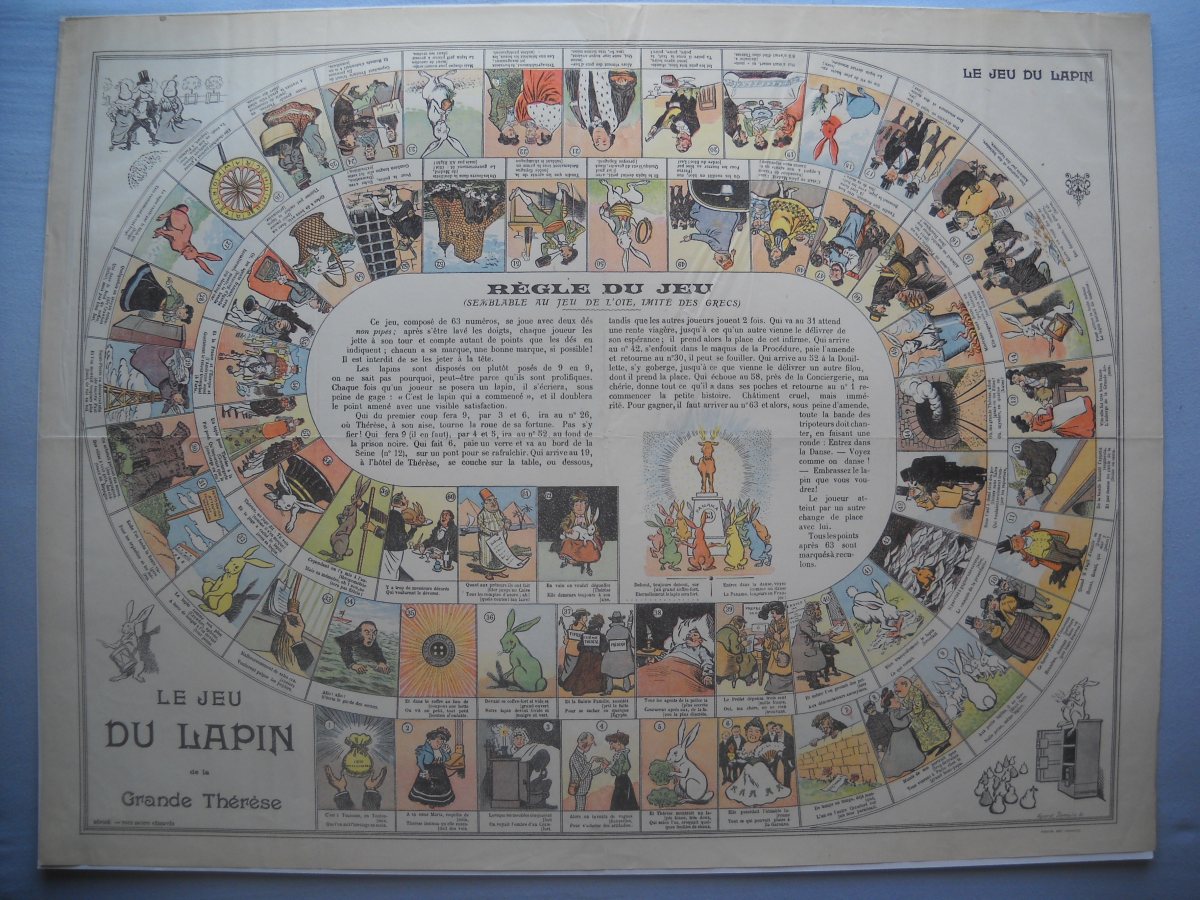 " Le jeu du lapin de la grande thérèse ", 50 x 65 cm - " Jeu de miousic ", 28 x 38 cm - " Jeu des combinés Barral ", 22 x 30 cm - " L'affaire Dreyfus et de la vérité ", 48 x 64 cm - " Jeu de l'épopée de Jeanne d'Arc ", 49 x 60cm - " Règle du jeu du coq ", 42 x 55 cm - " Jeu de l'oie renouvellé des Grecs ", 36 x 43 cm - etc.
