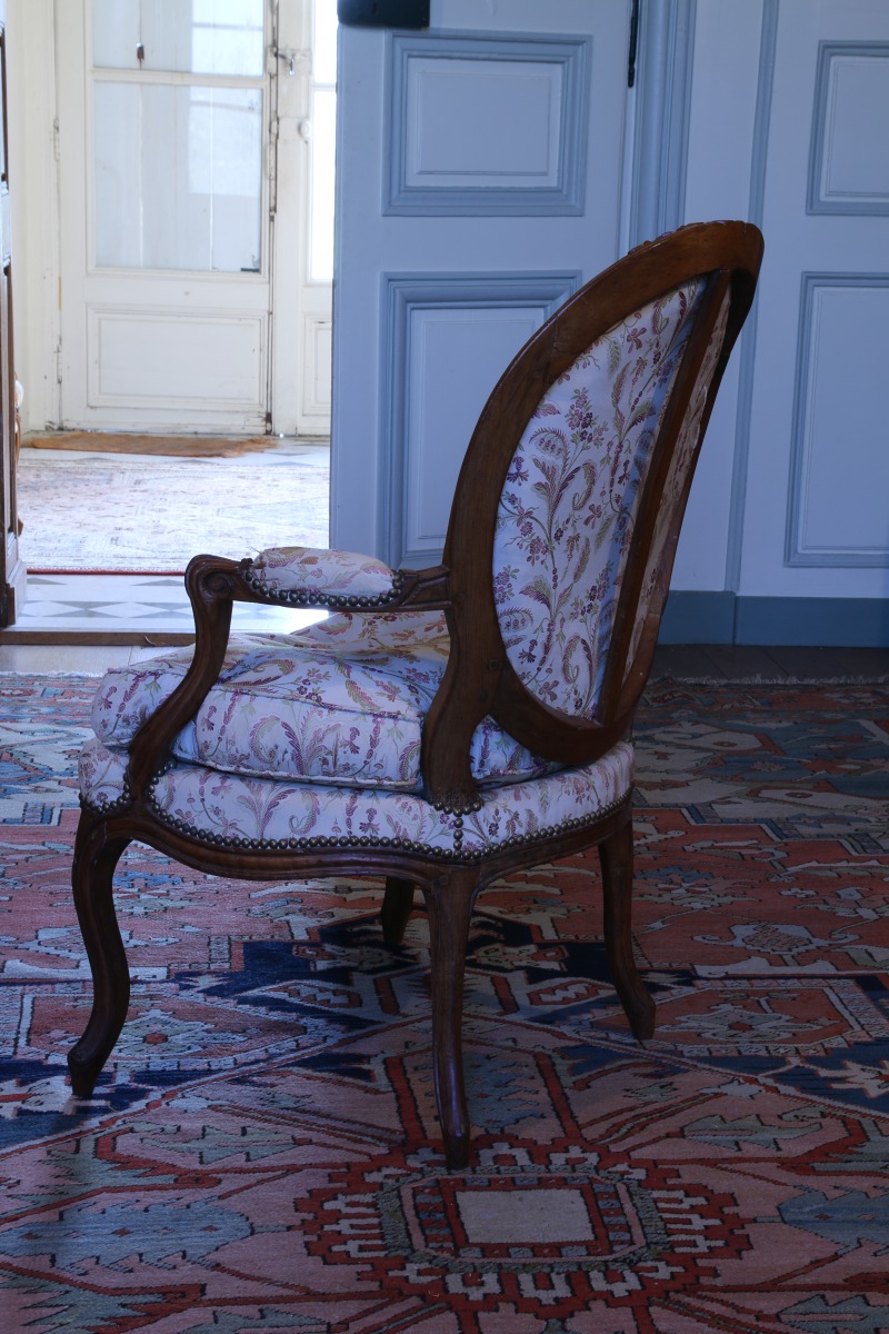 FAUTEUIL CABRIOLET en bois naturel sculpté et mouluré. Décor de nud rubané sur la traverse haute du dossier médaillon et en ceinture. Accotoirs en coup de fouet. Pieds nervurés et cambrés.