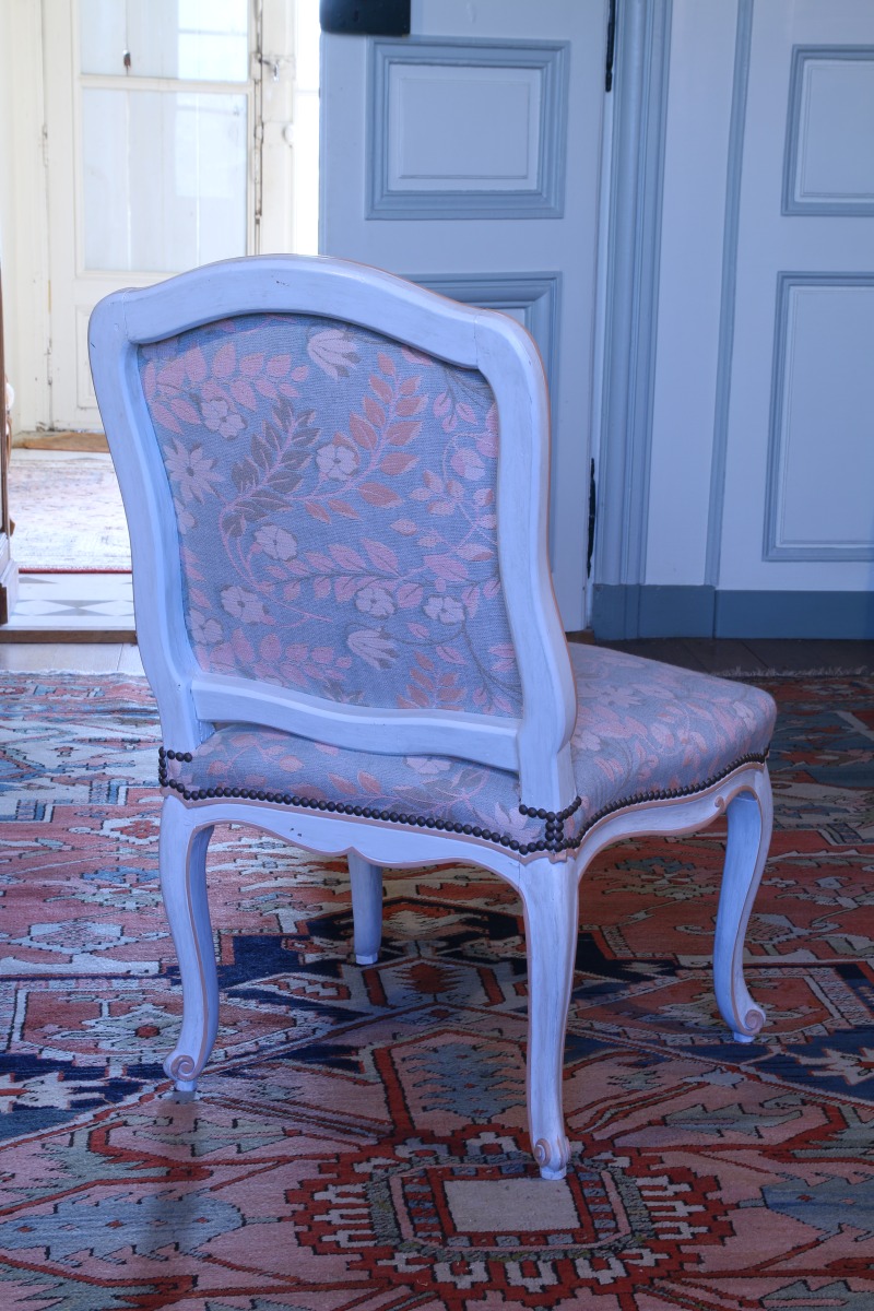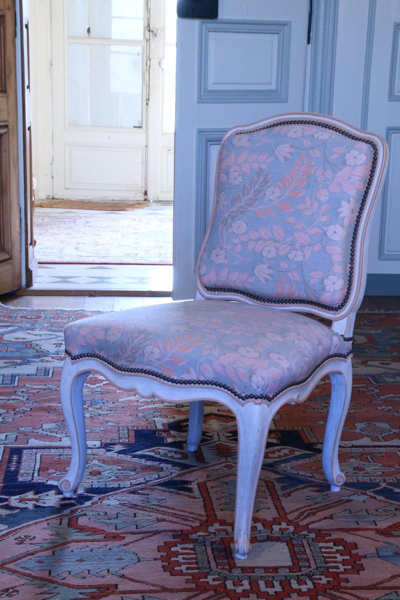 CHAISE en bois mouluré et relaqué blanc et saumon. Elle repose sur quatre pieds galbés à enroulement.