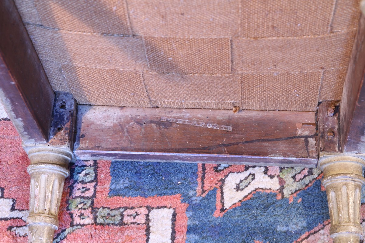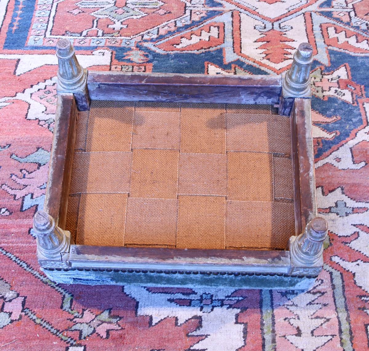 BOUT DE PIED en bois mouluré, sculpté et laqué gris. Dés de raccordement à fleurons. Pieds fuselés et cannelés.