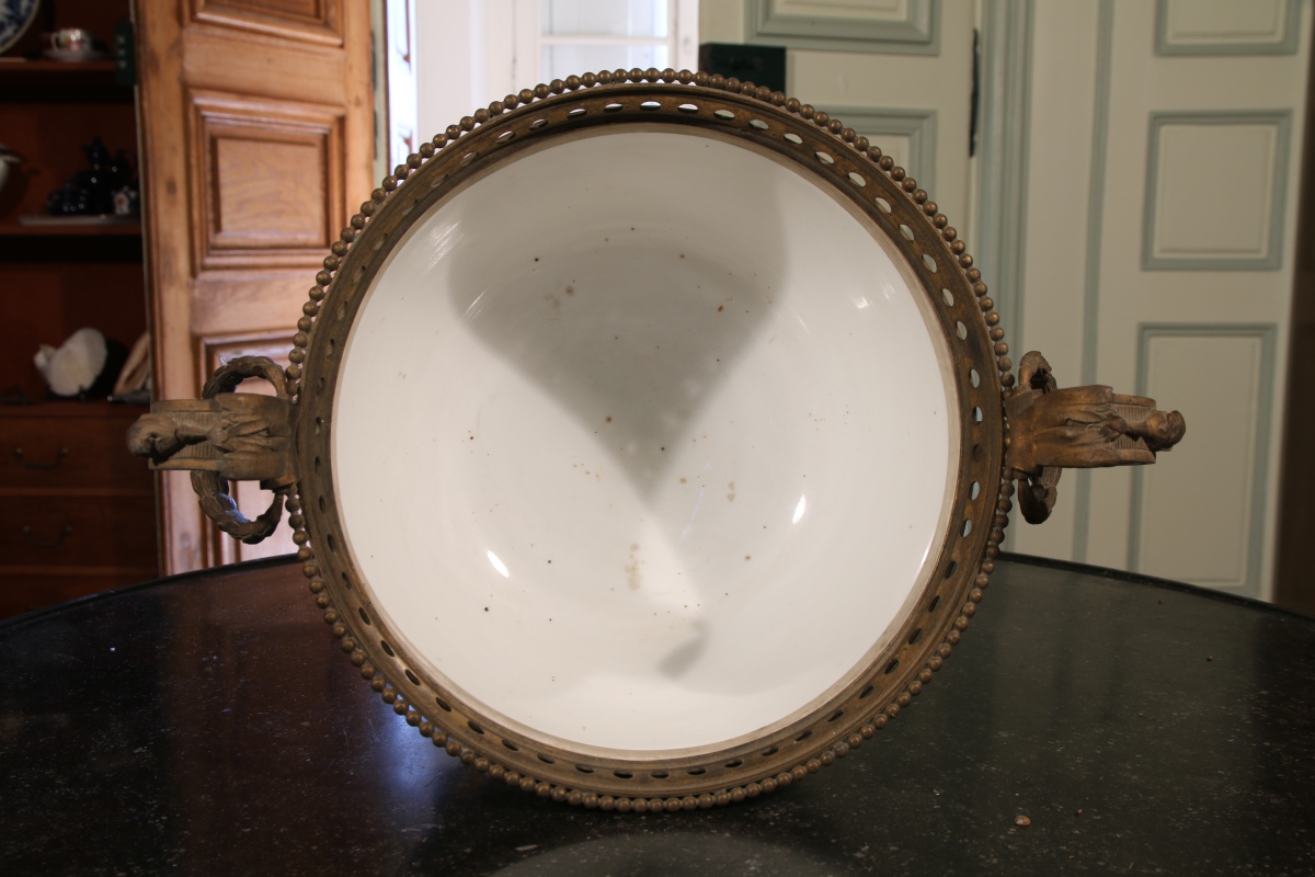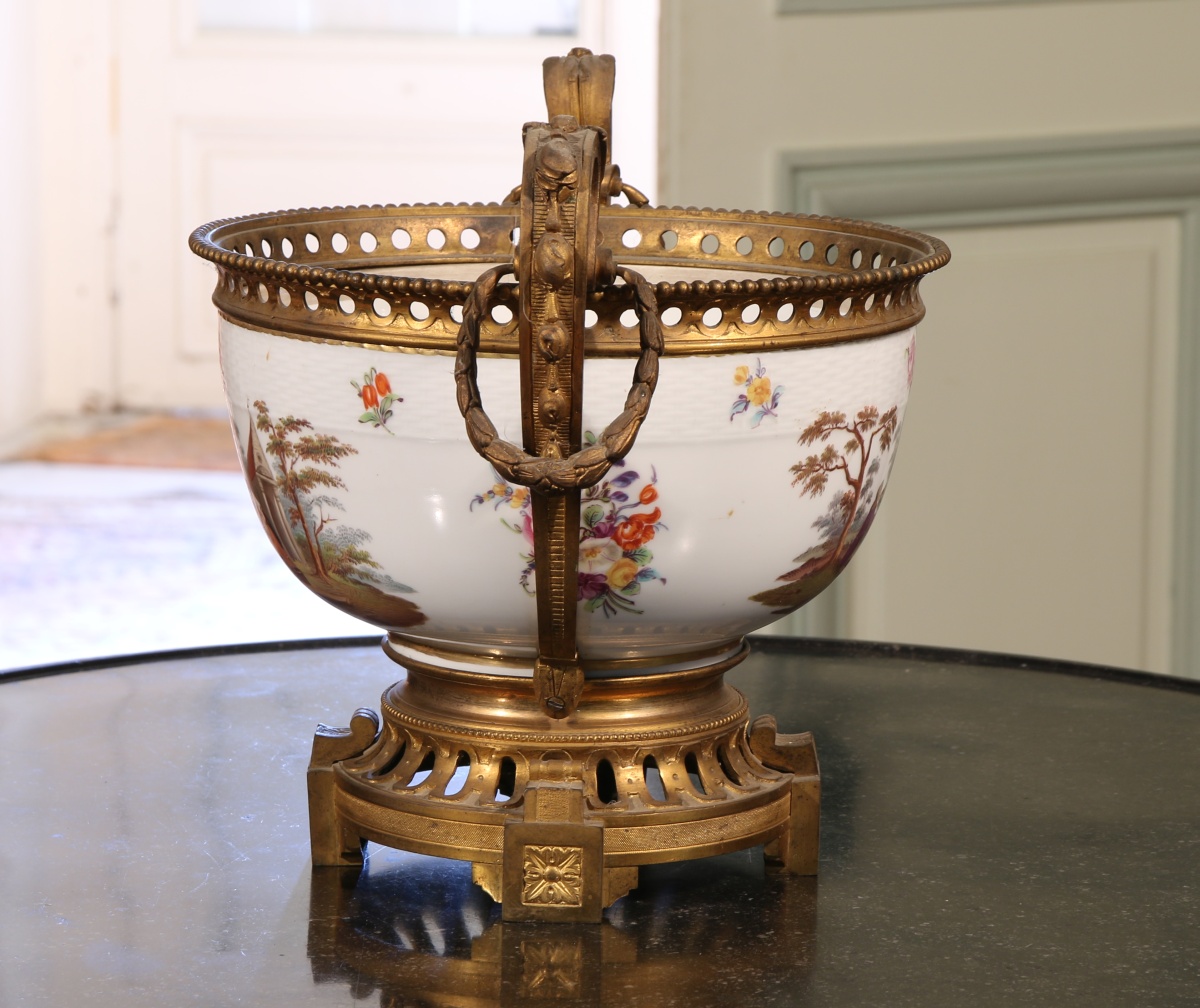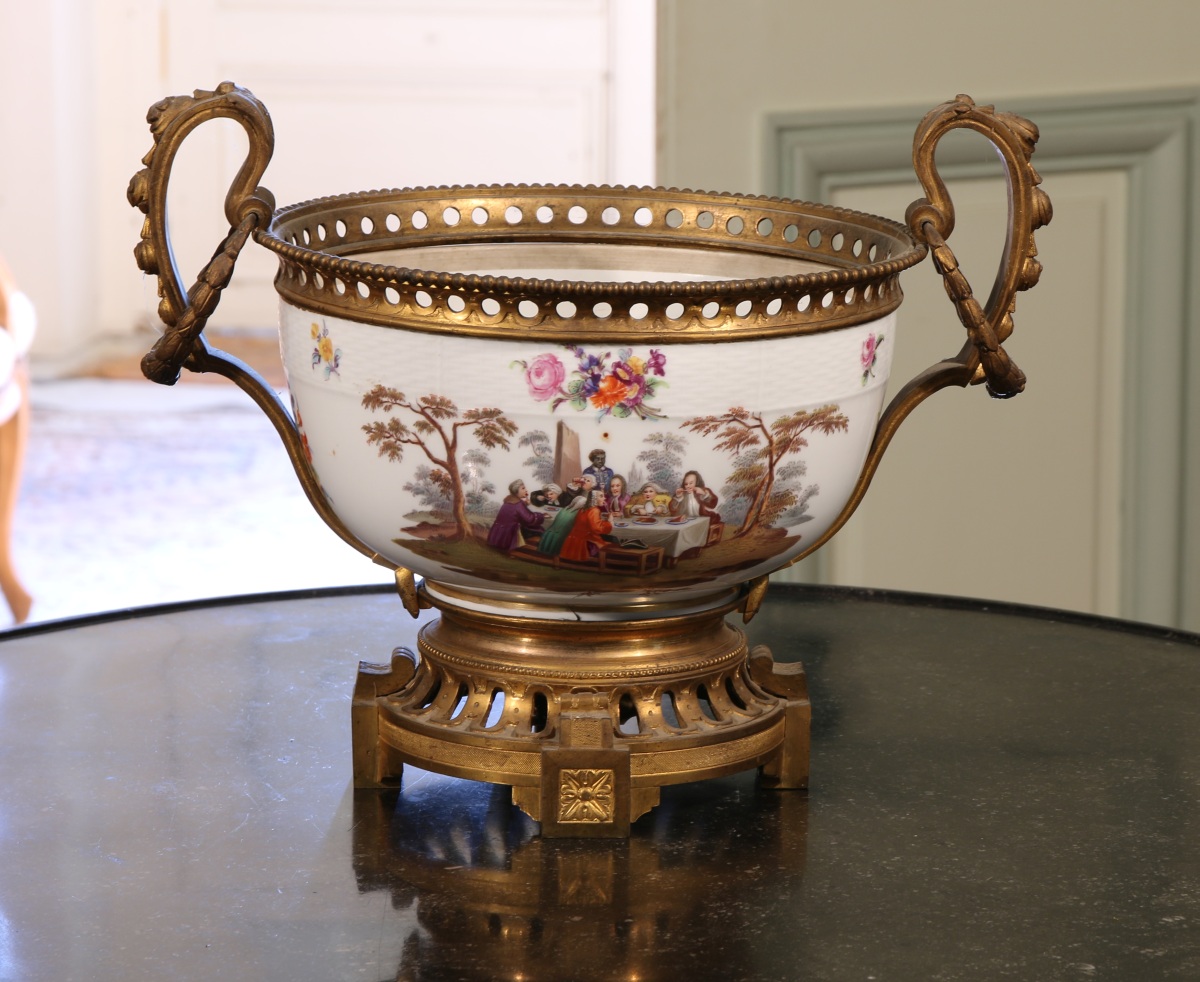 BERLIN. Important CACHE-POT en porcelaine à décor polychrome sur fond paysagé de personnages attablés d'un côté et jouant (?) de l'autre. Bordure moulée d'un motif à l'imitation de la vannerie. Riche monture en bronze ciselé et doré à décor ajouré de style Louis XVI tel que frises d'oves, rais de perles et dés fleuronnés. Les anses latérales agrémentées de guirlandes de lauriers.