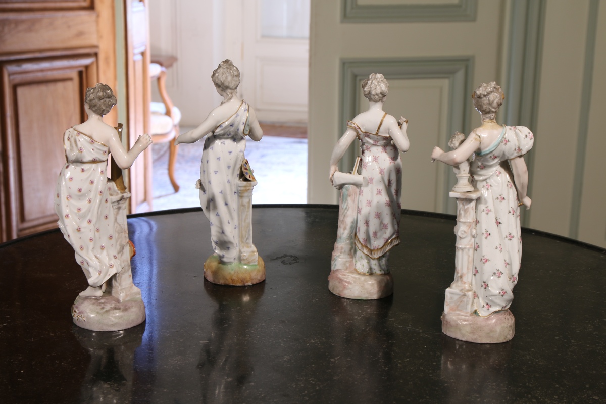DRESDE genre, MEISSEN dans le goût. Suite de 4 FIGURINES en porcelaine émaillée polychrome figurant les allégories des arts libéraux: peinture, sculpture, musique et architecture, sur des socles rocailles mouvementés avec un cartouche.
