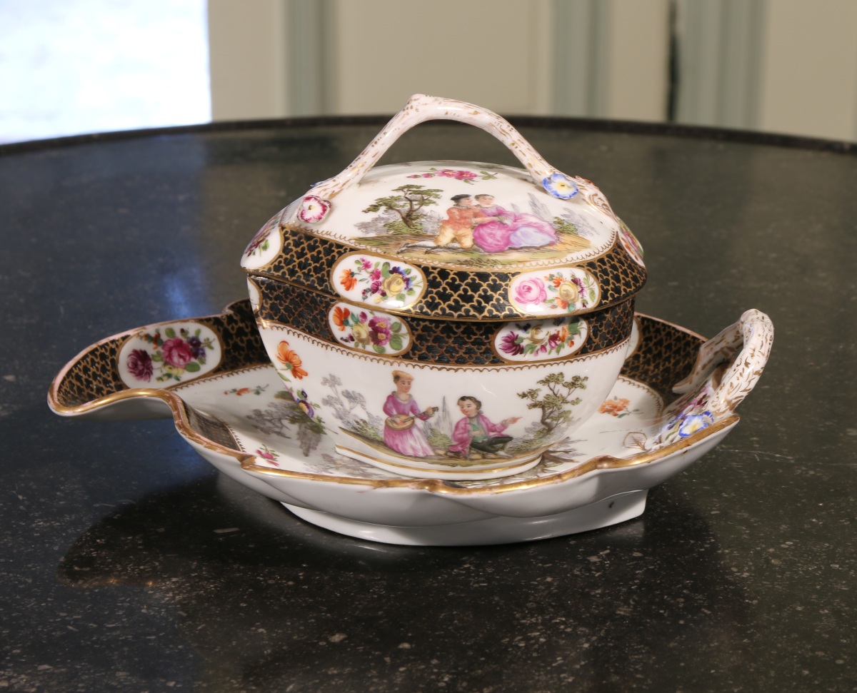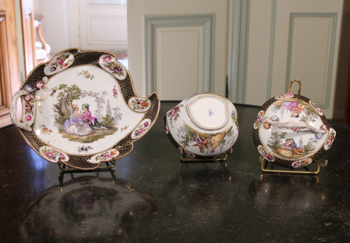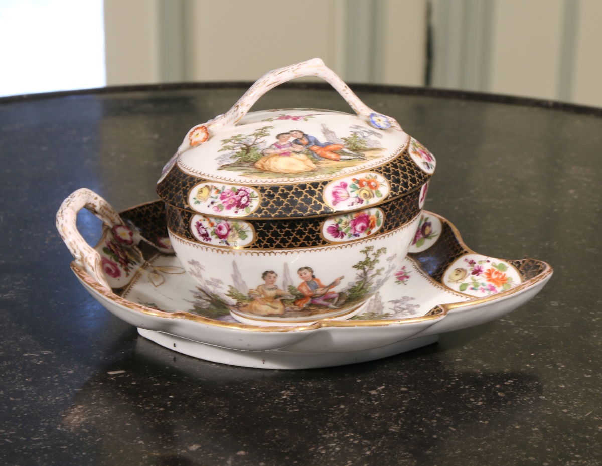 DRESDE, genre de MEISSEN. Écuelle à bouillon couverte et son présentoir en forme de feuille. Décor polychrome et or de scènes bucoliques sur fond paysagé. Bordure à fonds bleu orné de nuées agrémentée de bouquets de fleurs dans des réserves. Prises à l'imitation d'une branche. Marque apocryphe inspirée d»Auguste Rex »"AR" en bleu sous couverte.