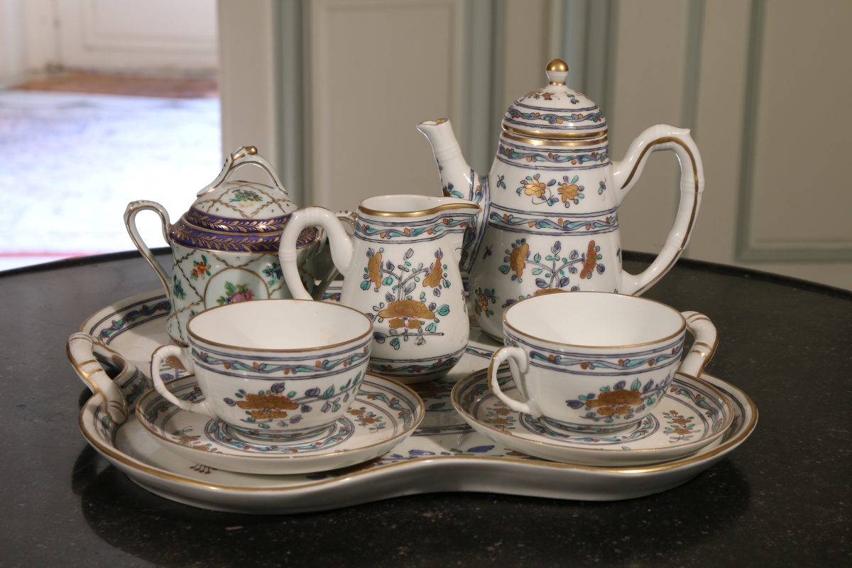 DÉJEUNER en porcelaine, 5 pièces, à décor sinisant en bleu, vert et or de pivoines. Il se compose d'une verseuse, d'un pot-à-lait, de deux tasses et leurs sous-tasses et d'un plateau. Cachet "Mehun / France".