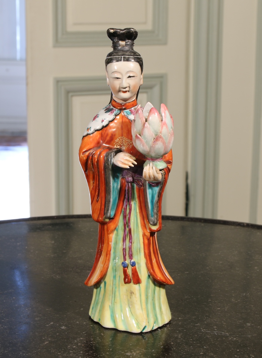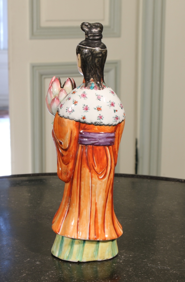 CHINE. STATUETTE de dignitaire formant flambeau en porcelaine émaillée polychrome. Il tient une fleur de lotus formant binet.