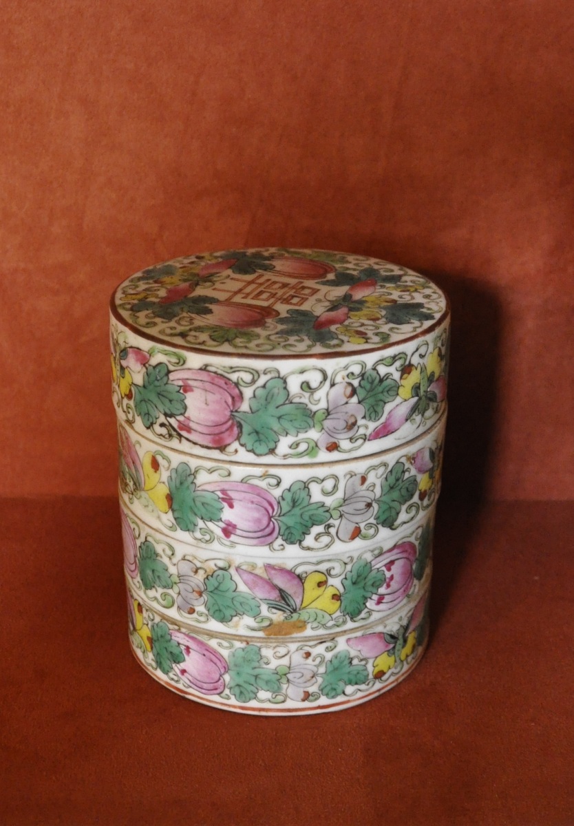 - BOÎTE "à étages" de forme ronde composée de trois boîtes s'empilant sur trois niveaux. Décor polychrome de fleurs, feuillages et papillons. Haut. 11,5, Diam. 10 cm.