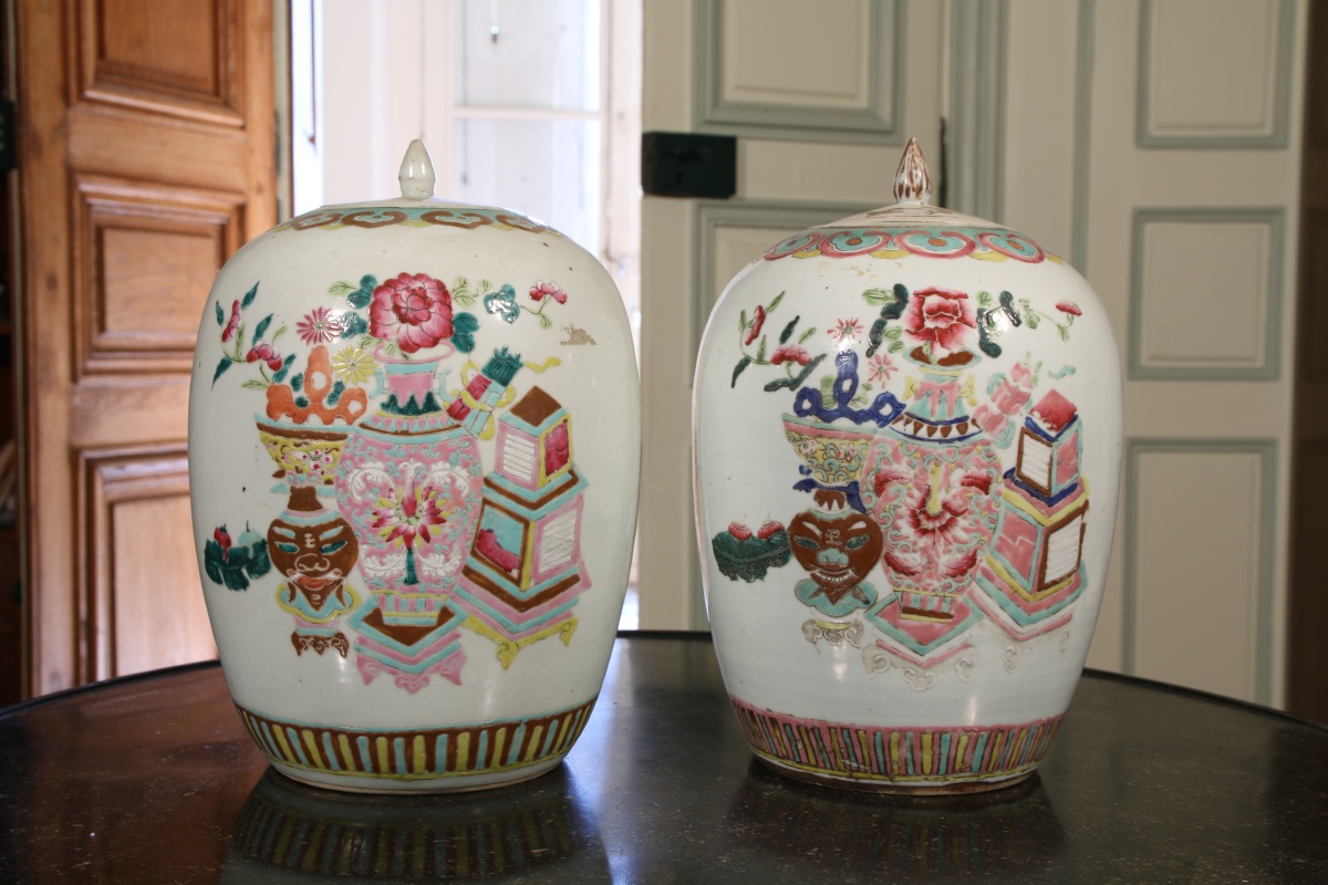 CHINE. Paire de POTS À GINGEMBRE à décor polychrome dit à l'échantillon.