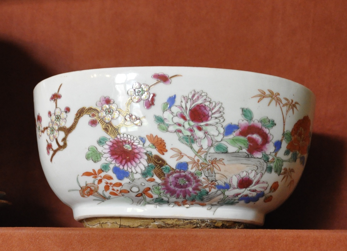- JATTE de forme ovale à décor de fleurs polychromes. Haut. 10, Long. 23 cm. (bord meulé).