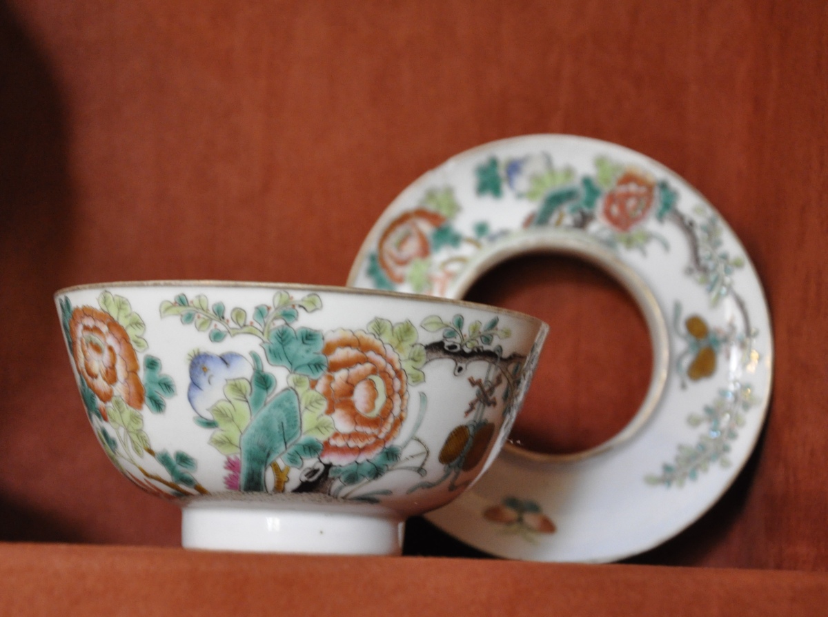 - Petit BOL et sa SOUS-TASSE ajourée à décor polychrome de branches fleuries et papillons. Haut. totale: 7 cm. (accidents).
