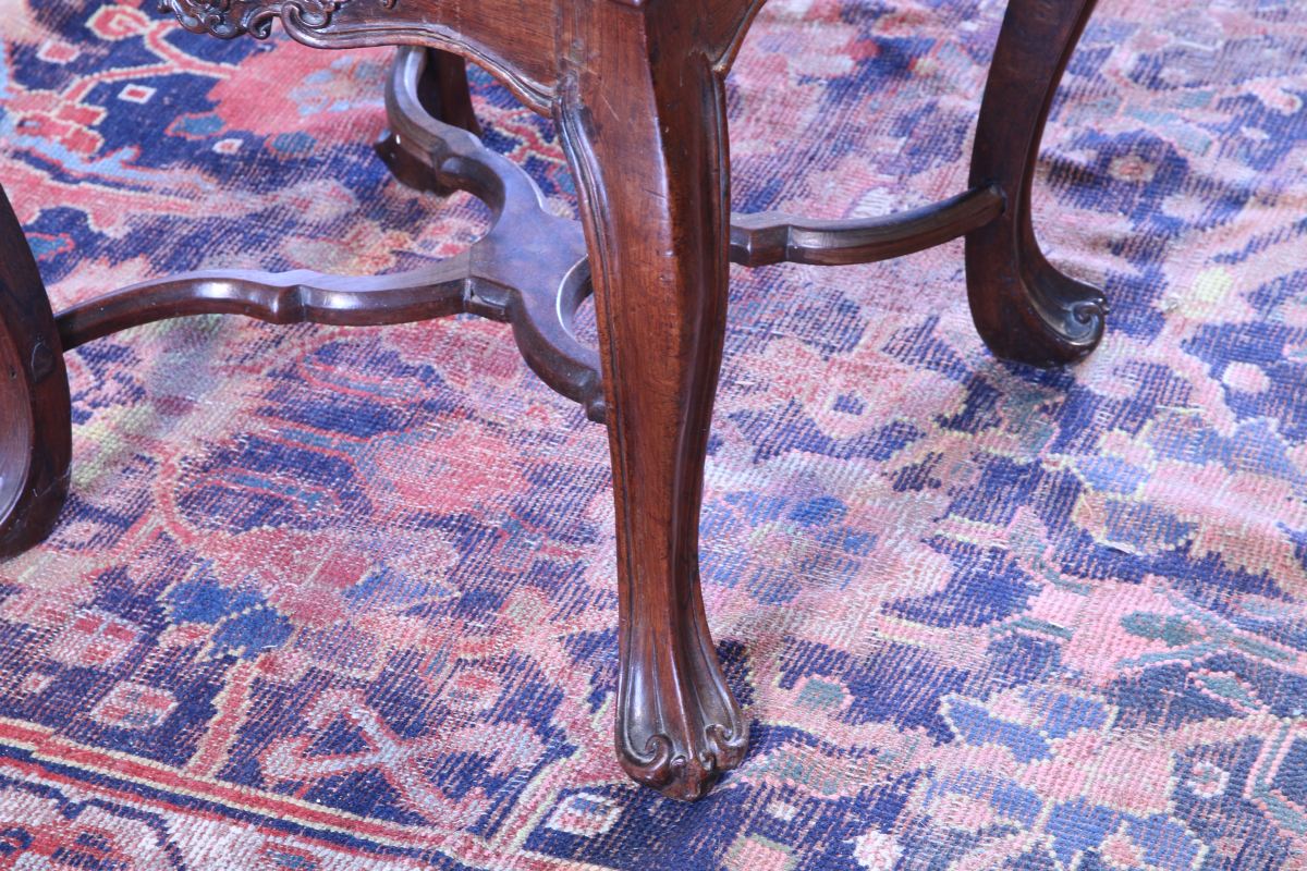 Beau TABOURET à CHÂSSIS en bois naturel mouluré et sculpté, la ceinture mouvementée ornée de médailles et d'arabesques reposant sur quatre pieds galbés terminés par des palmes à enroulements et réunis par une entretoise en X.
