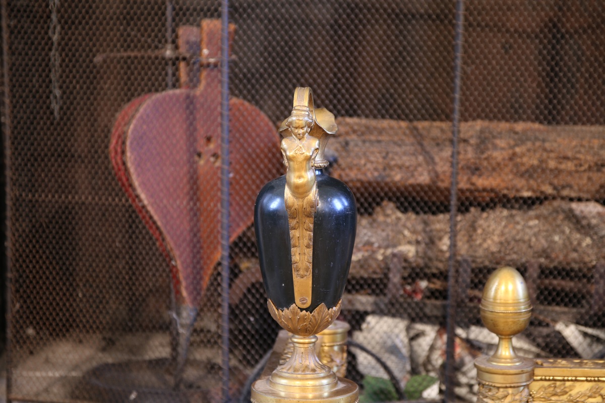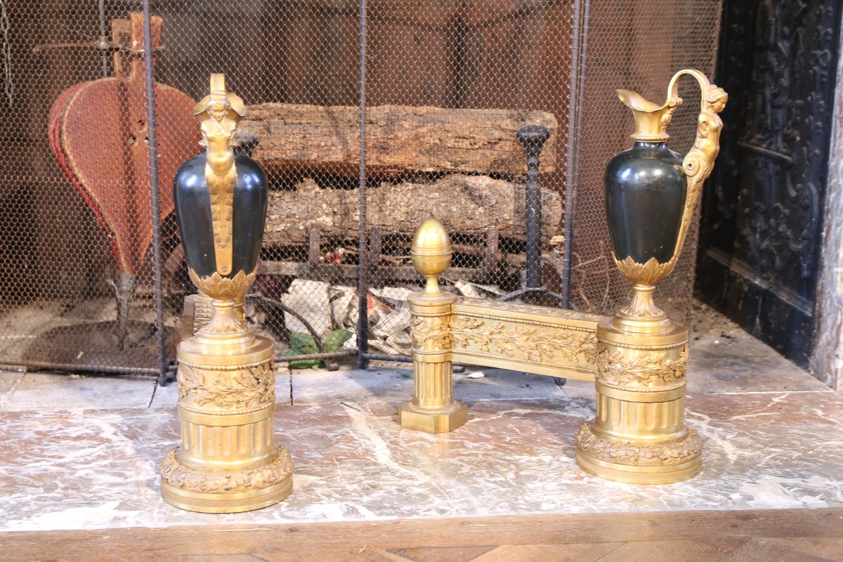 Belle PAIRE de CHENETS en bronze doré et patine Antique. Vase-buire aux termes féminins. Riche répertoire iconographique du XVIIIe : pomme de pin, tores de lauriers, flots, feuilles chêne, cannelures