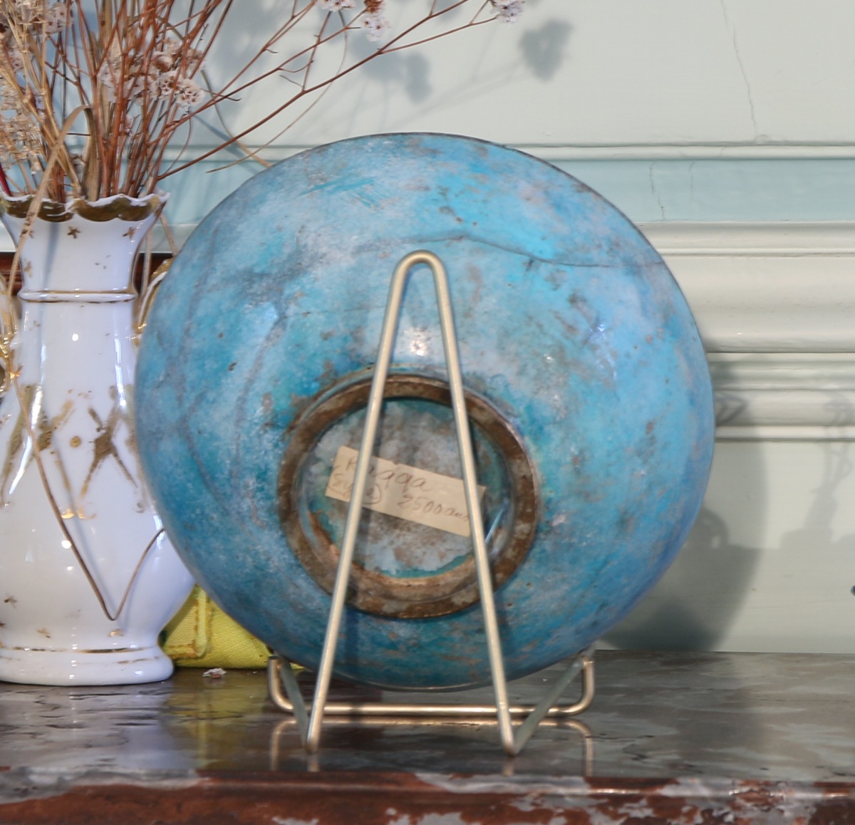Petite COUPELLE circulaire en céramique à glaçure bleue et motifs noirs.