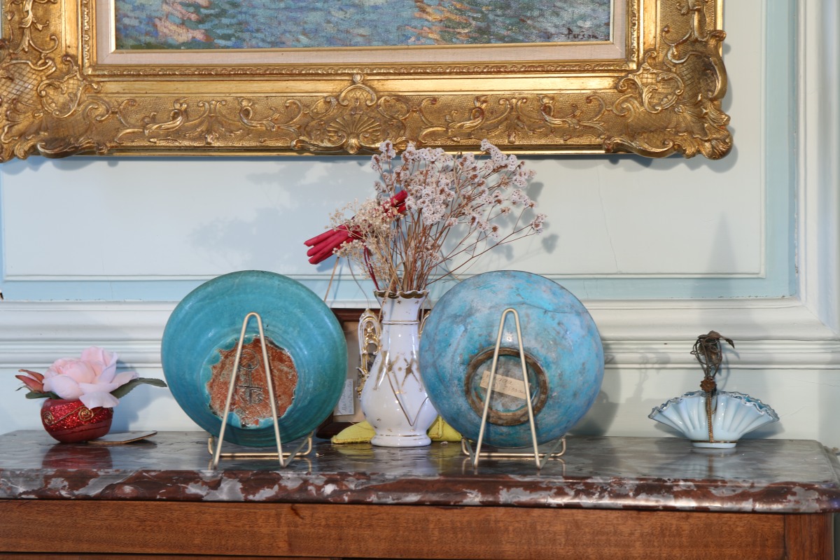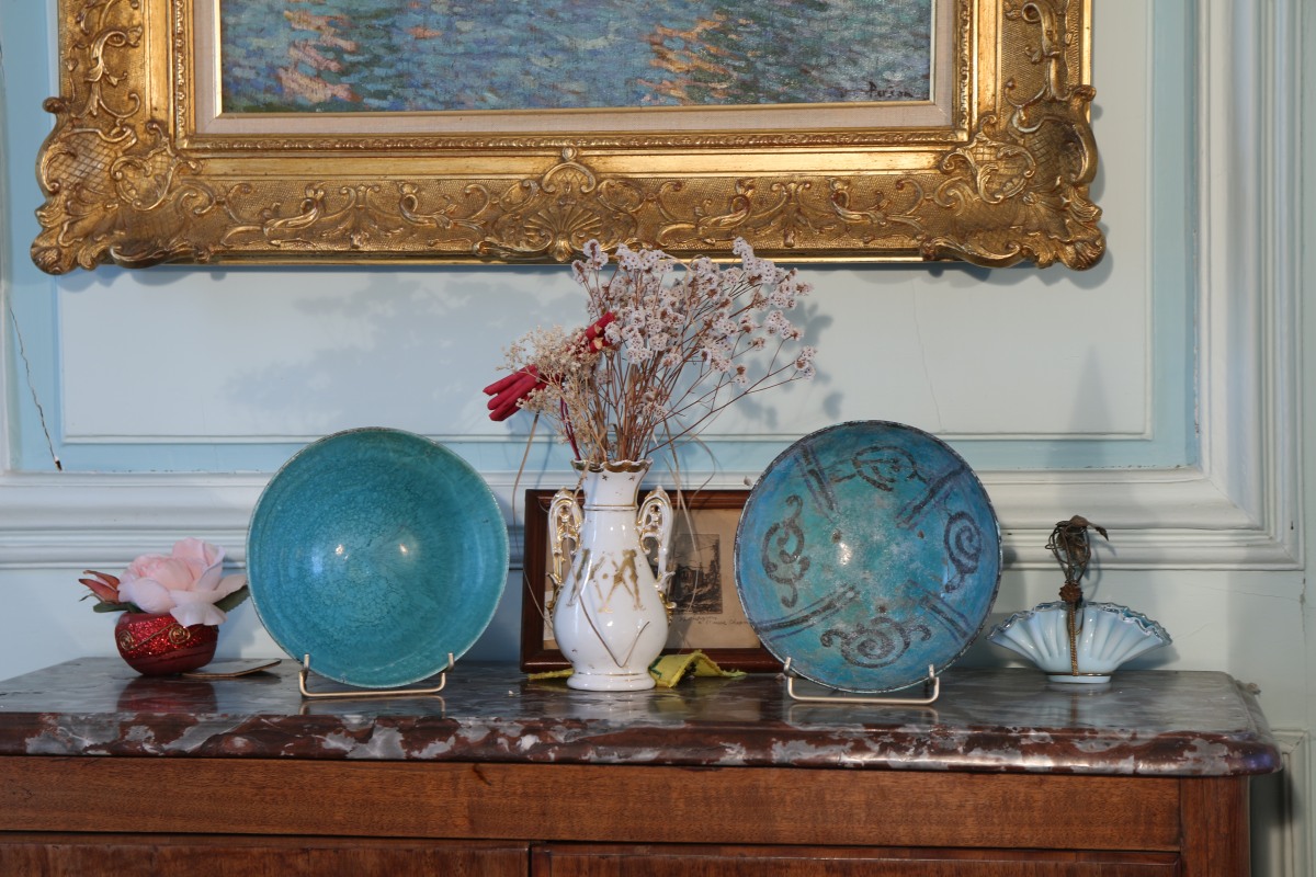 JOINT: RÉUNION de BIBELOTS sur l'armoire basse, dont: PANIER en forme de feuille et opaline bleu et monture métallique, petit VASE d'AUTEL monogrammé MA, petite COUPELLE circulaire en céramique à glaçure bleue et signée.