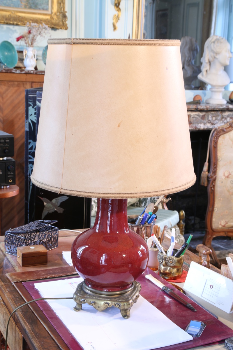 Monté en lampe à l'électricité avec base en bronze doré sur quatre pieds feuillagés et abat-jour de couleur crème.