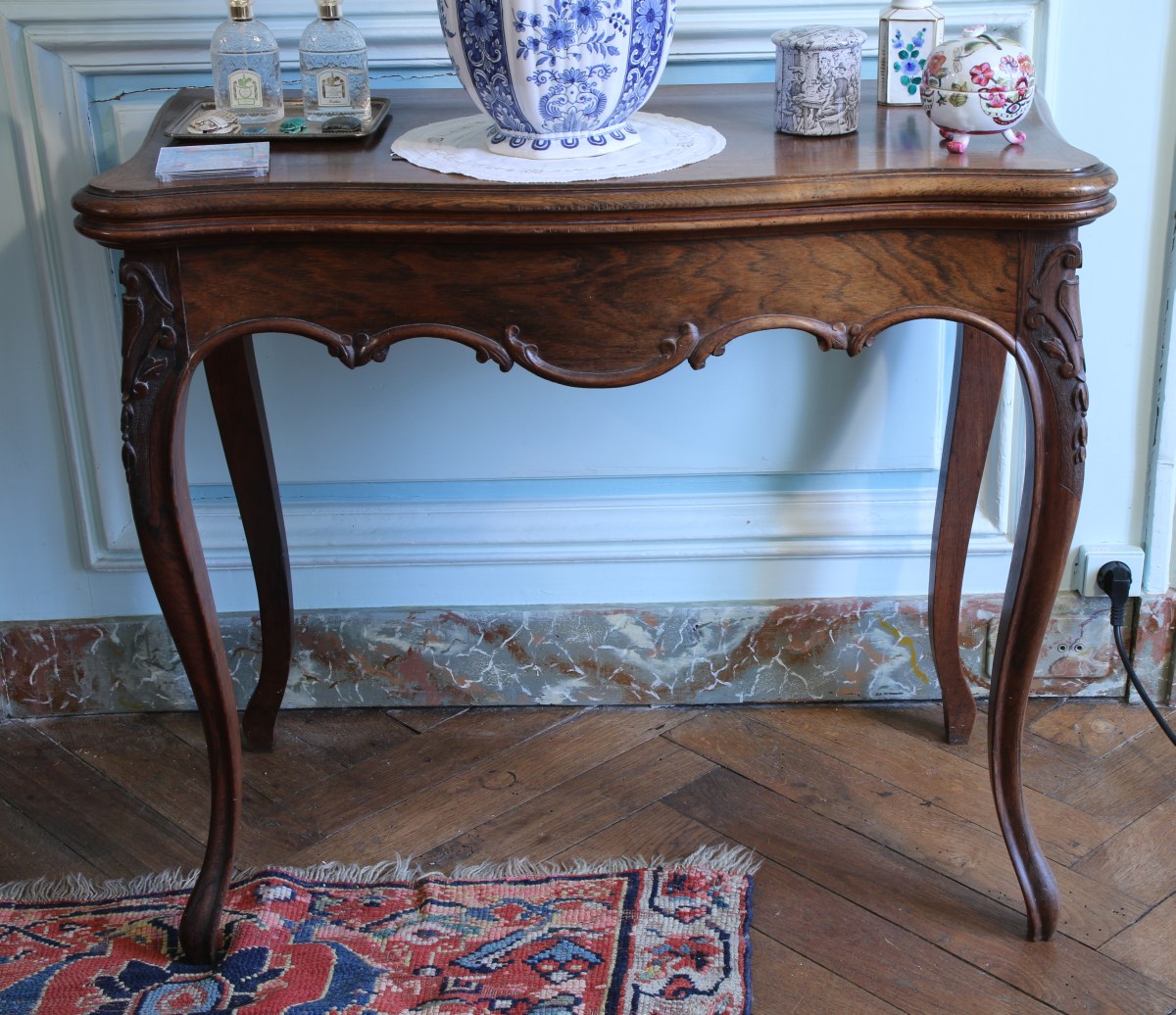 TABLE À JEU en bois mouluré de feuillages et cartouche, la ceinture et le plateau mouvementés, reposant sur quatre pieds galbés.