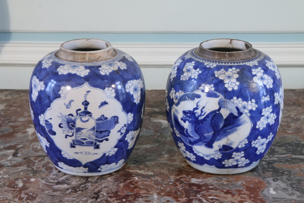 CHINE. Deux POTS À GINGEMBRE en porcelaine bleu et blanc. L'un à décor de dragon dans un cartouche entouré de fleurs, l'autre de vases fleuris. Couvercle en ébène ajouré et sculpté d'arabesques.
