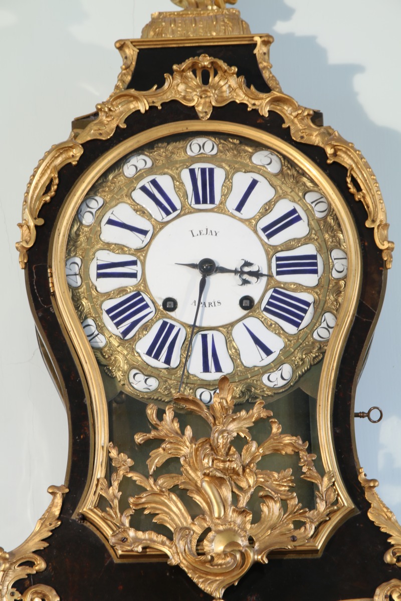 CARTEL DAPPLIQUE et sa CONSOLE en écaille brune. Riche ornementation de bronzes dorés dacanthes, coquille,. Mouvement signé LEJAY A PARIS.