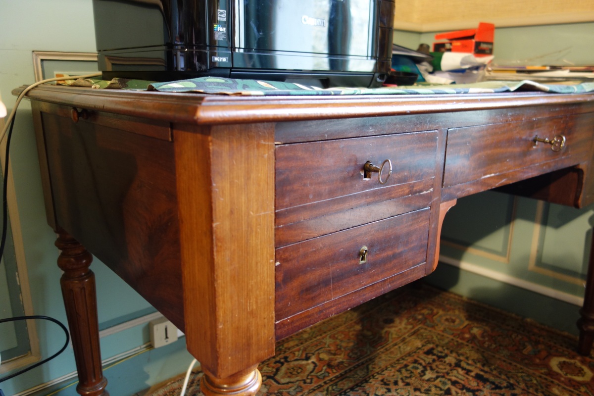 BUREAU À CAISSON en acajou et placage, le plateau de forme rectangulaire foncé d'un cuir, ouvrant par quatre tiroirs en façade et reposant sur quatre pieds balustre.