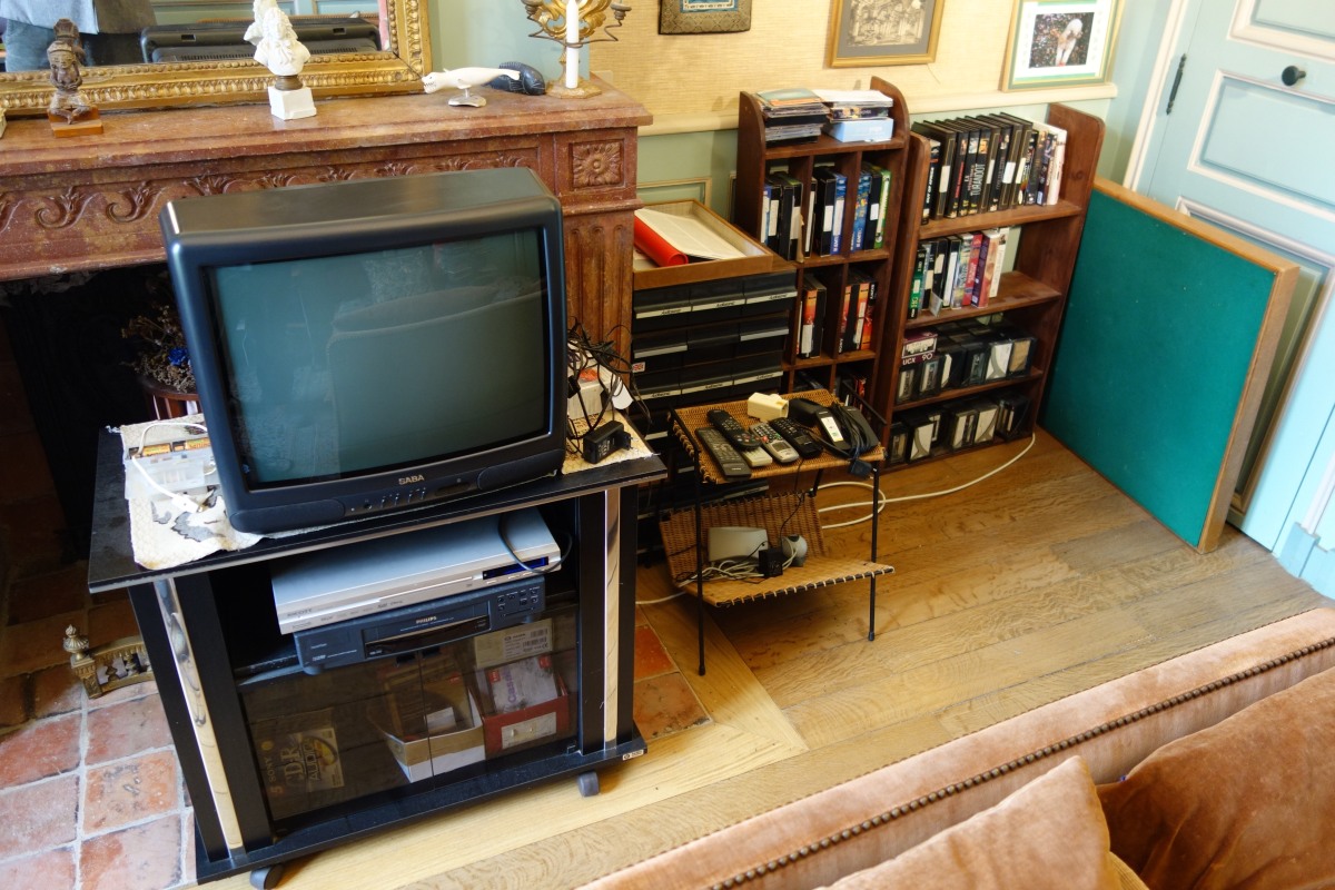 JOINT: TÉLÉVISEUR et son MEUBLE de présentation, LECTEUR de DVD, ainsi qu'une RÉUNION de CASSETTES VHS, divers petits MEUBLES DE RANGEMENT, un LIT DE REPOS recouvert d'un velours jaune et un petit TABOURET de pied À BASCULE en bois, deux PANIERS en osier,