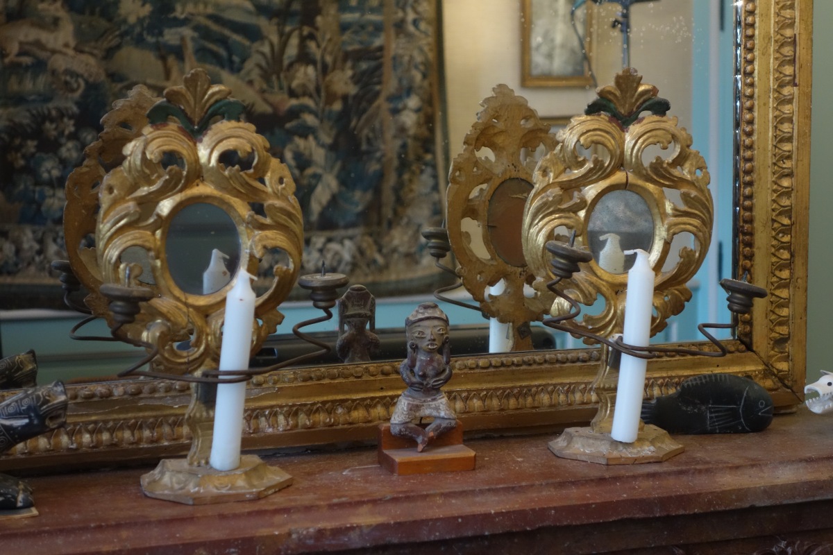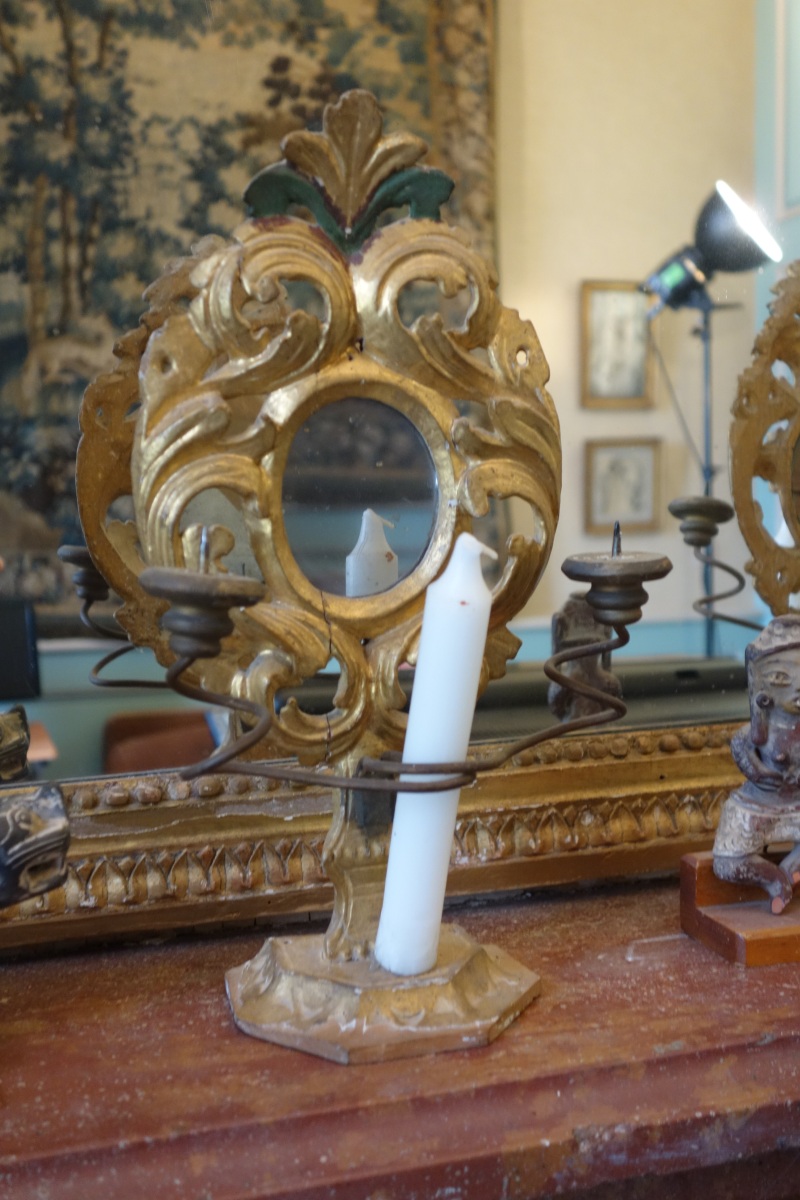 Paire de PORTE BOUGIE en bois doré à motif de feuillagé en bois doré orne d'un miroir central à deux bras de lumière en métal.