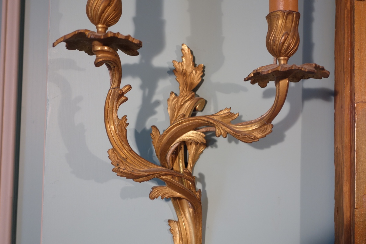 PAIRE D'APPLIQUES en bronze doré à deux bras de lumières richement feuillagés réunis sur un corps central figurant un rameau d'acanthe mouvementé.