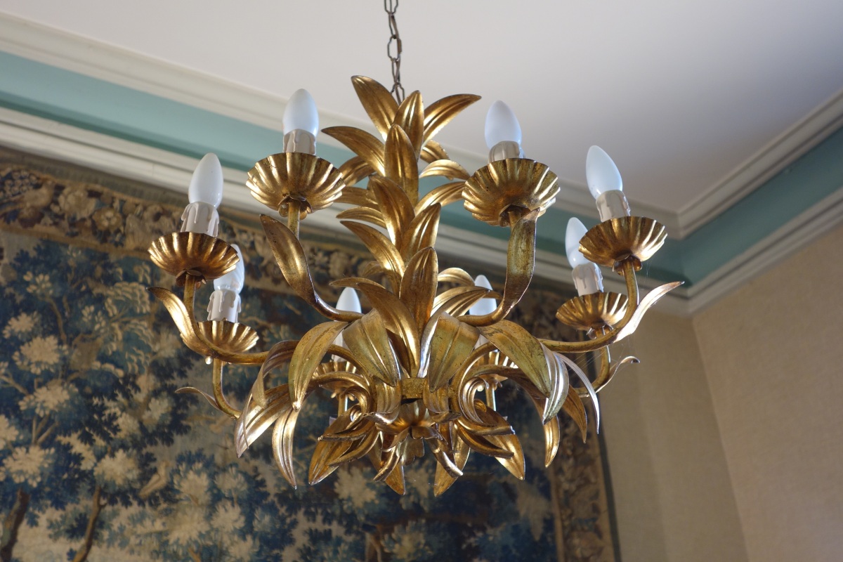 LUSTRE FEUILLES en métal doré à huit bras de lumières électrifiés.