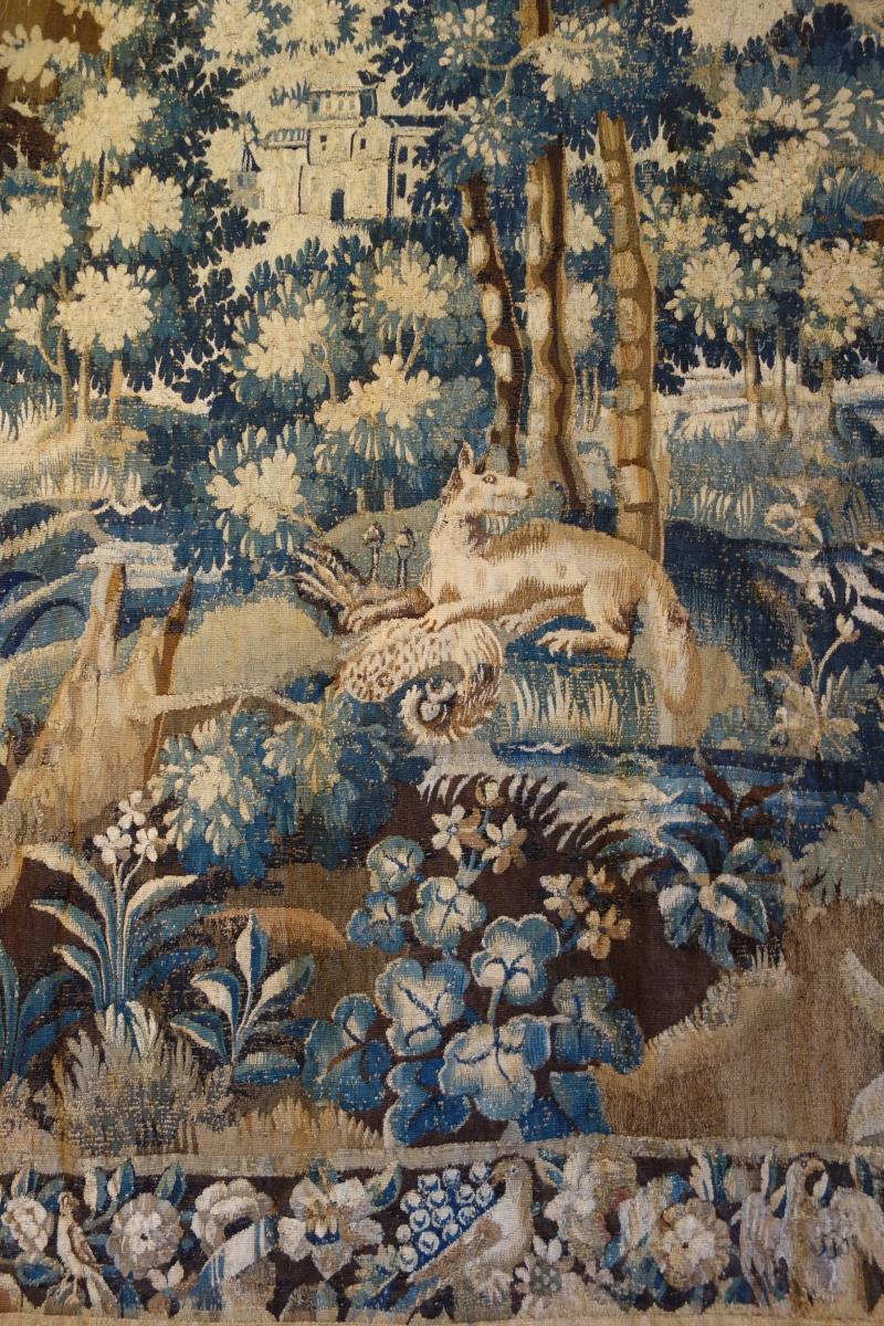 AUBUSSON. VERDURE. Tapisserie en laine figurant un fauve dévorant un volatile dans un paysage au village. Belle bordure à décor d'oiseaux et de fleurs.