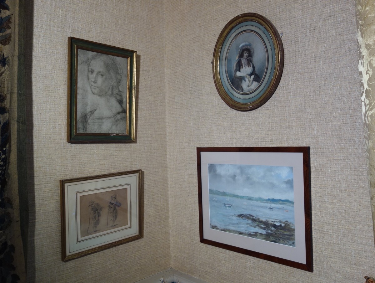 JOINT: gravure de mode rehaussée en couleur, portrait d'une vagabonde, aquarelle figurant La rivière d'Auray en 1996 et afiche d'un port pointilliste.