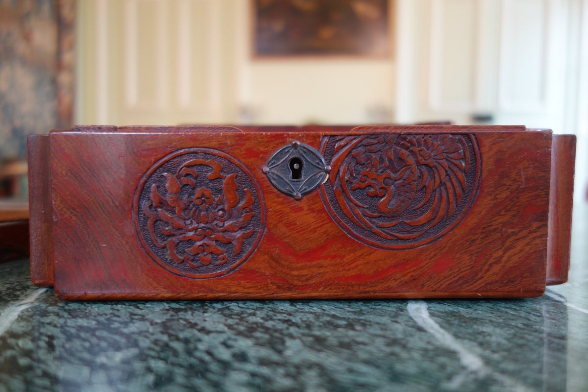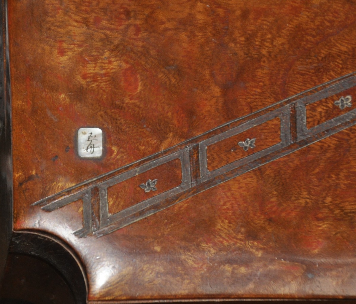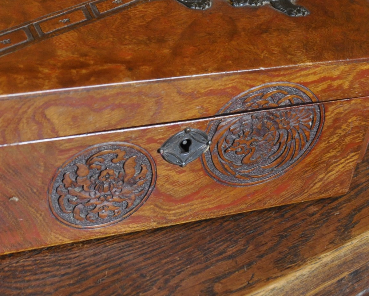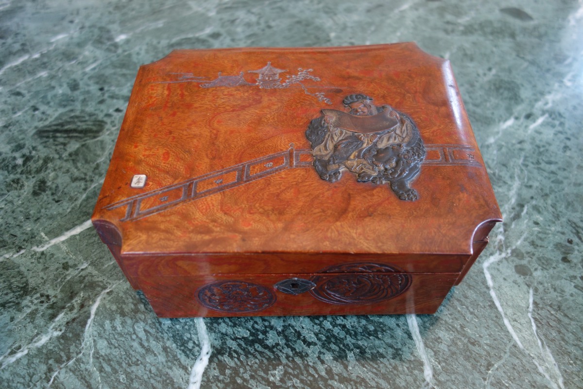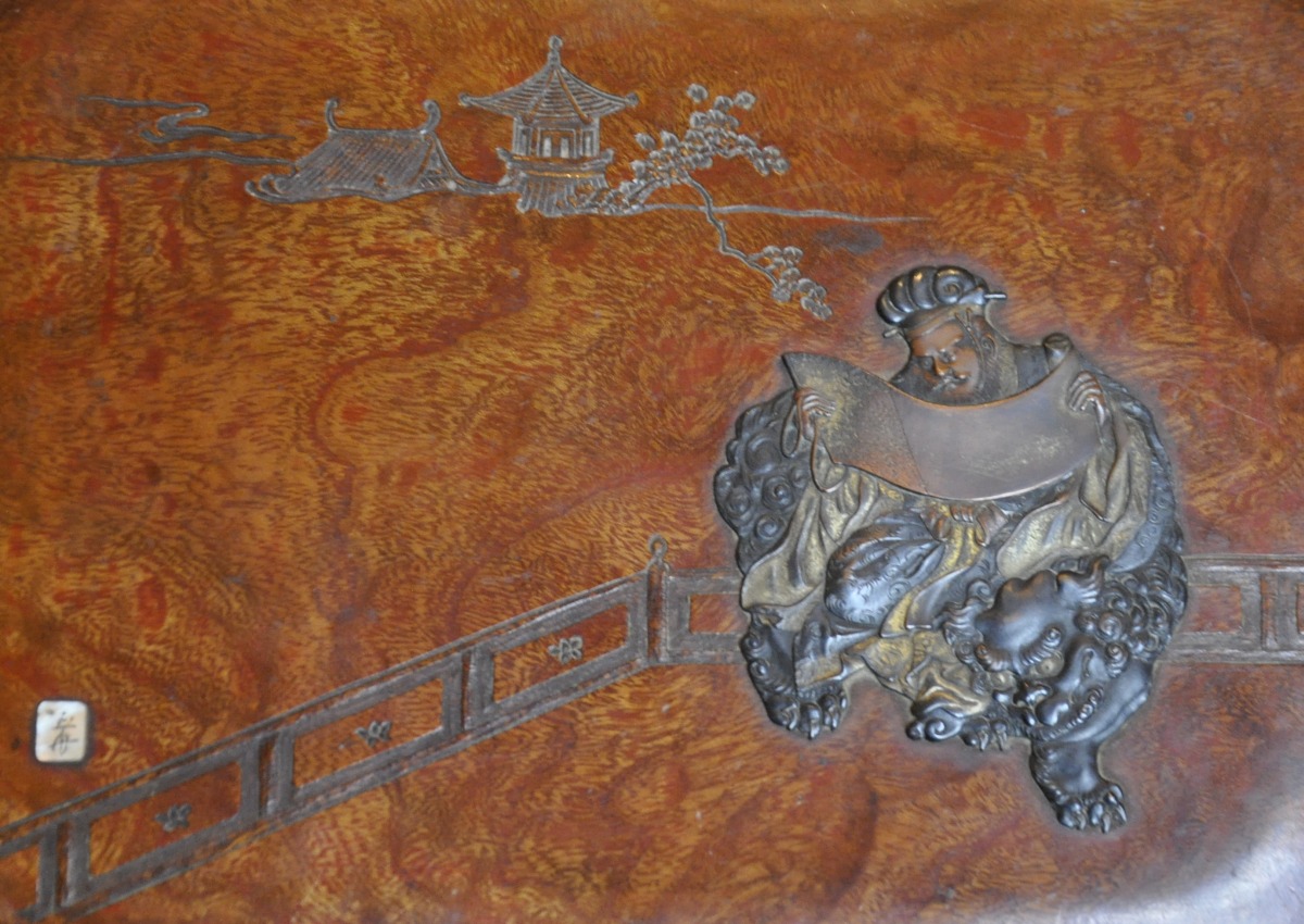 JAPON. BOÎTE de forme rectangulaire à angles concaves en bois précieux. Le couvercle sculpté d'un décor paysagé appliqué d'un personnage lisant un rouleau sur une bête fantastique en cuivre patiné de deux tons. Les côtés ornés de cartouches sculptés de forme ronde. Signature dans un cartouche de nacre.