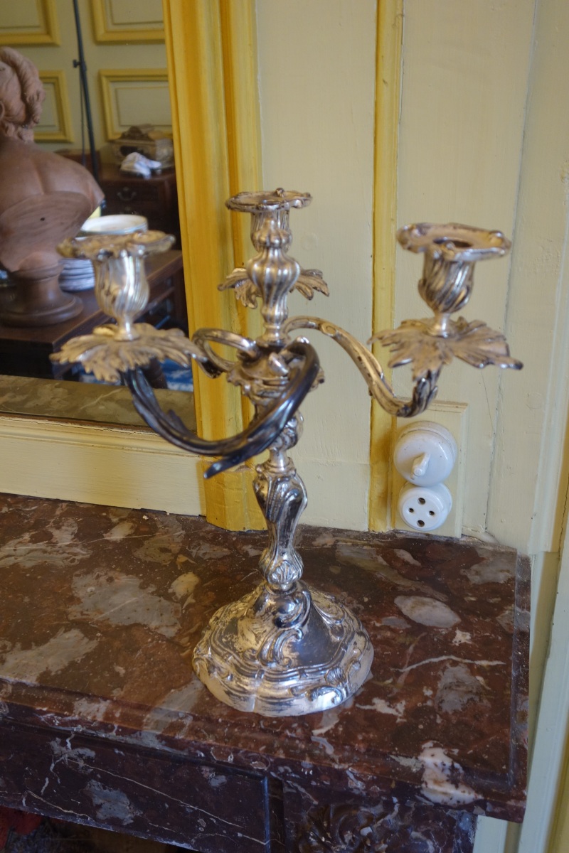 PAIRE de CANDÉLABRES à trois lumières en métal argenté. Modèle mouvementé à décor rocaille d'acanthes, coquilles et agrafes.