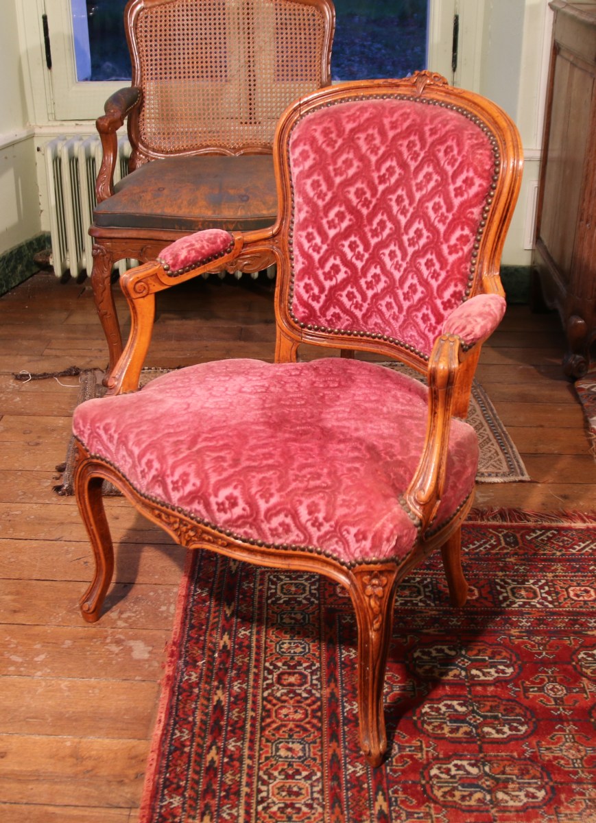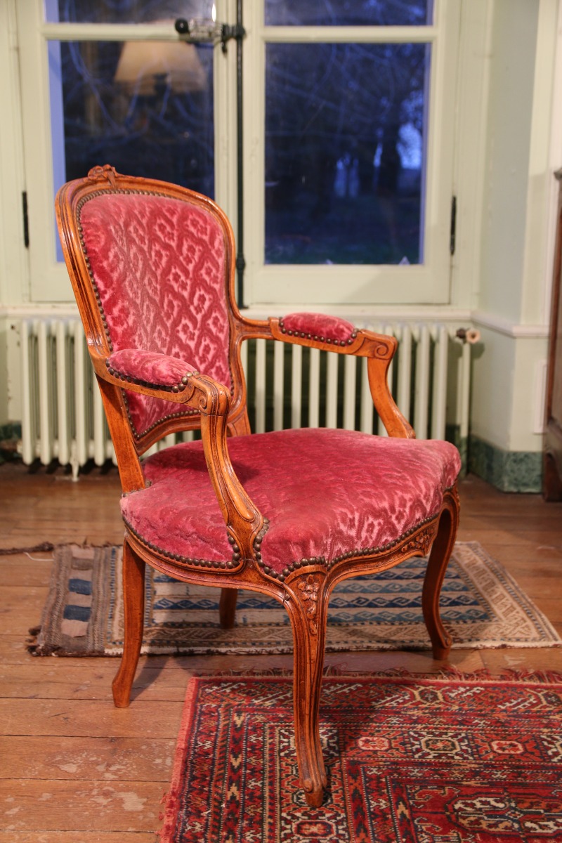 SUITE de SIX FAUTEUILS CABRIOLET en bois naturel mouluré et sculpté. Dossier légèrement violoné. Accotoirs à manchettes reposant sur des consoles galbées. Décor de fleurs en ceinture. Ils reposent sur quatre pieds cambrés.