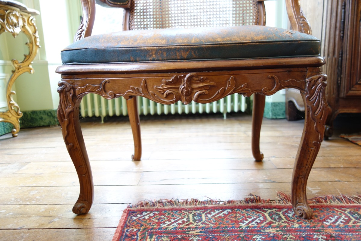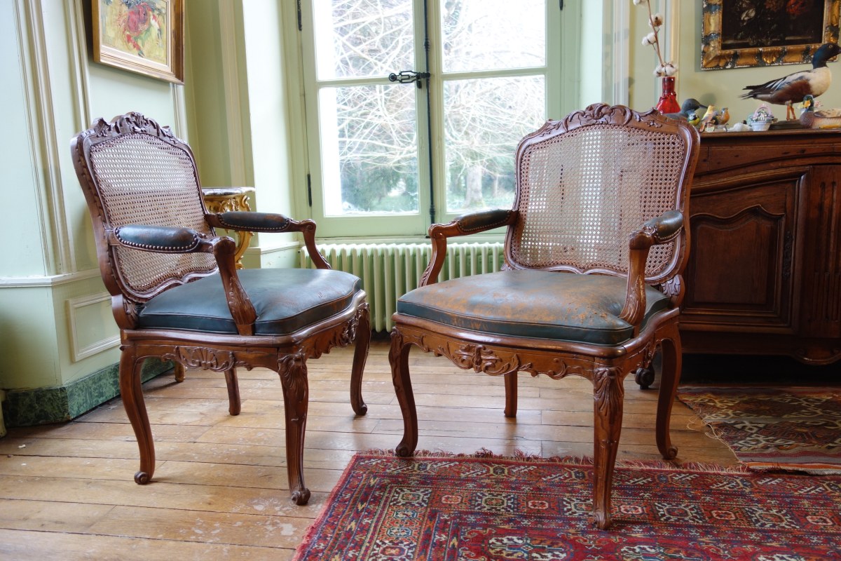 PAIRE de FAUTEUILS À LA REINE cannés en bois naturel mouluré et sculpté. Riche ornementation de feuilles d'acanthe stylisées, coquilles et enroulements. Accotoirs à manchettes. Ils reposent sur quatre pieds cambrés.